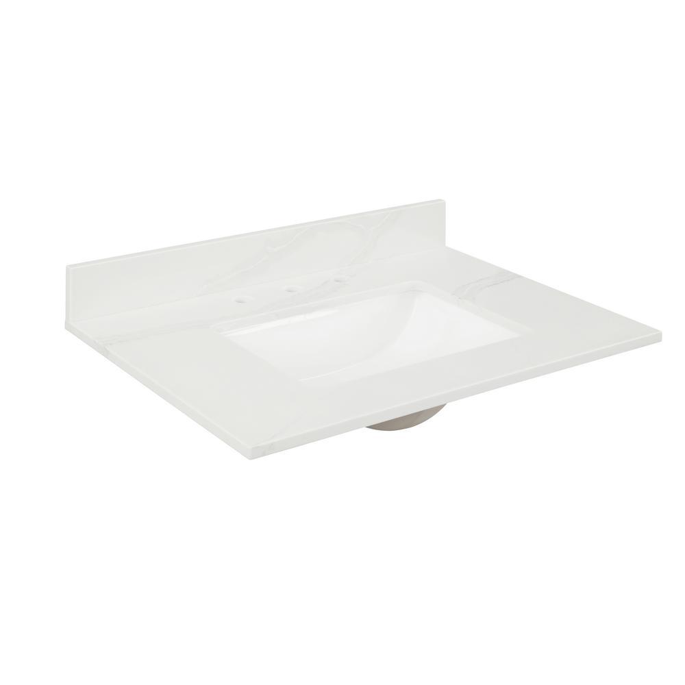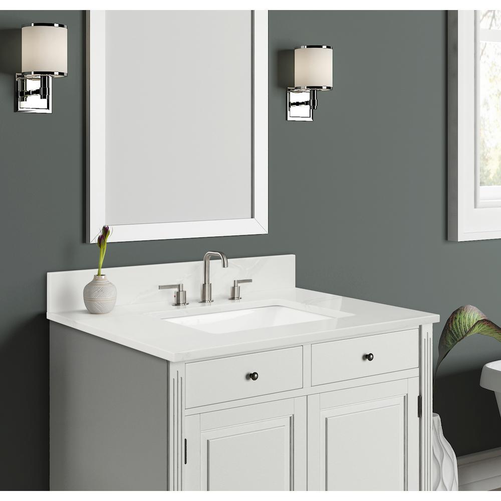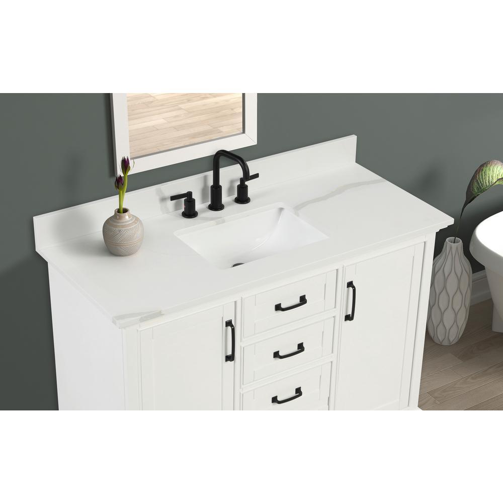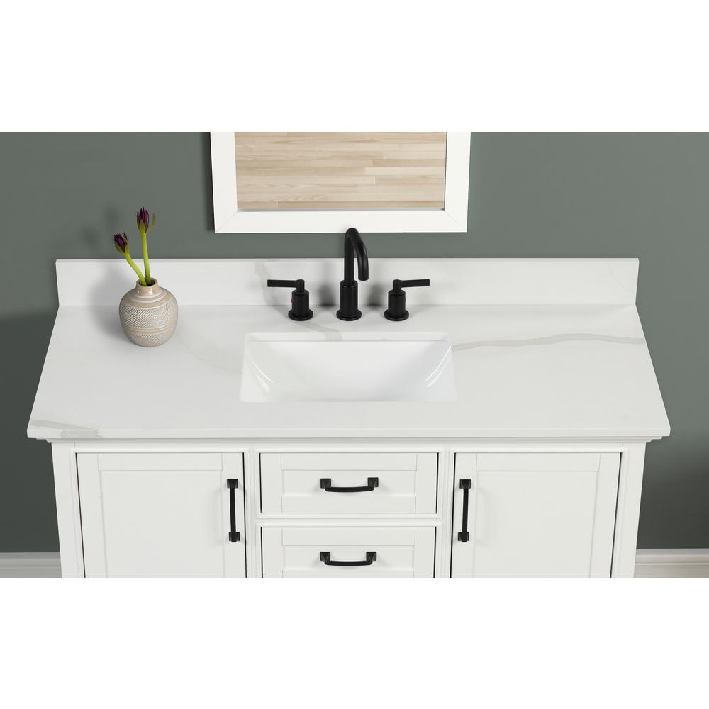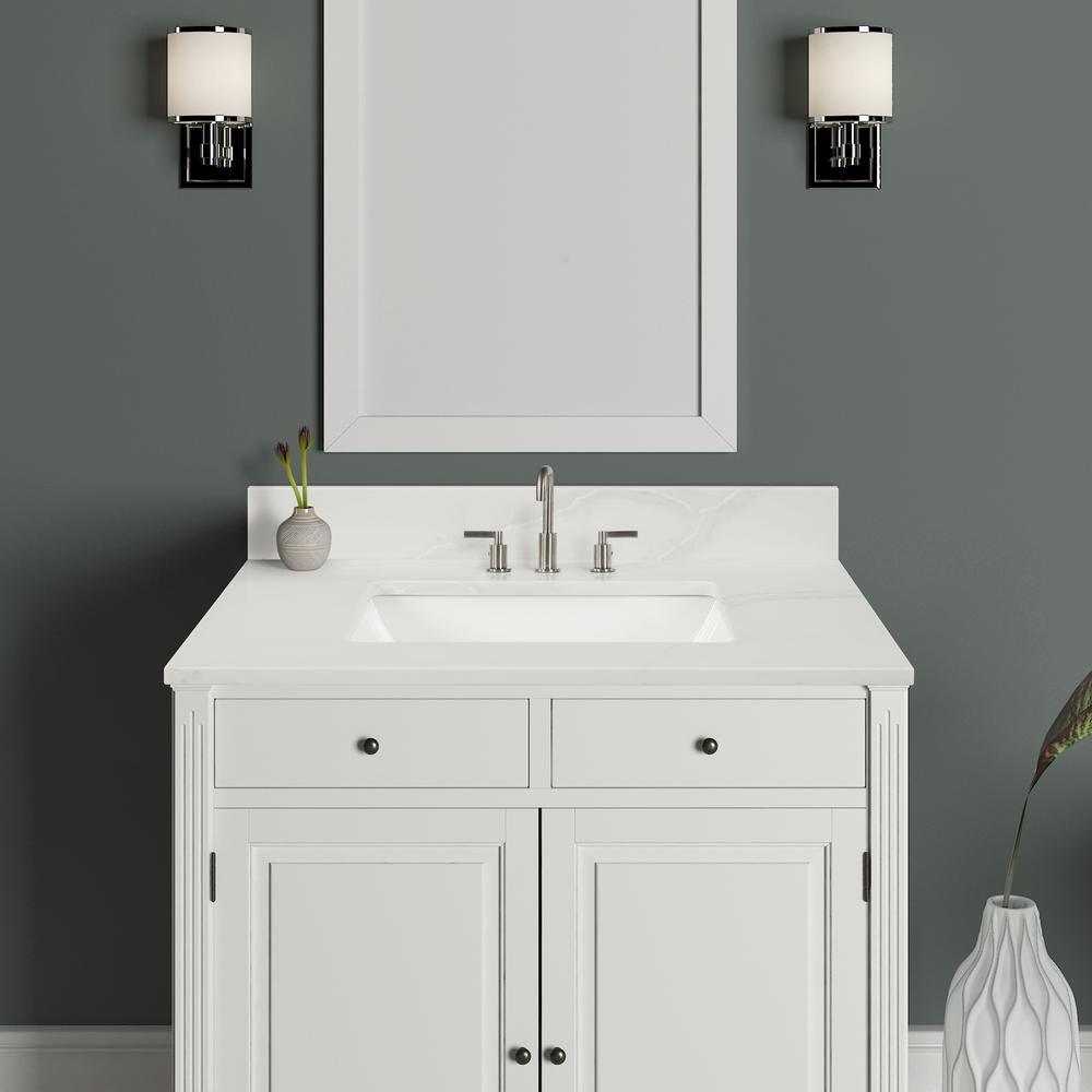 49 in. Statuario White Quartz Top. Attached stylish rectangular white vitreous china undermount bowl with safety overflow hole. 4 in. high backsplash included to help protect walls from water damage.