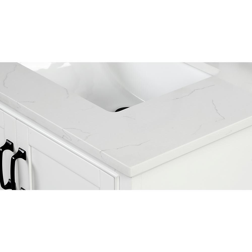 49 in. Carrara White Quartz Top. Attached stylish rectangular white vitreous china undermount bowl with safety overflow hole. 4 in. high backsplash included to help protect walls from water damage.