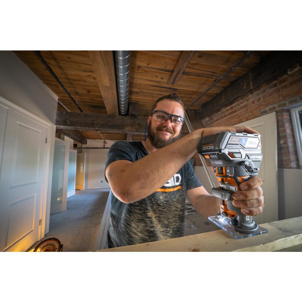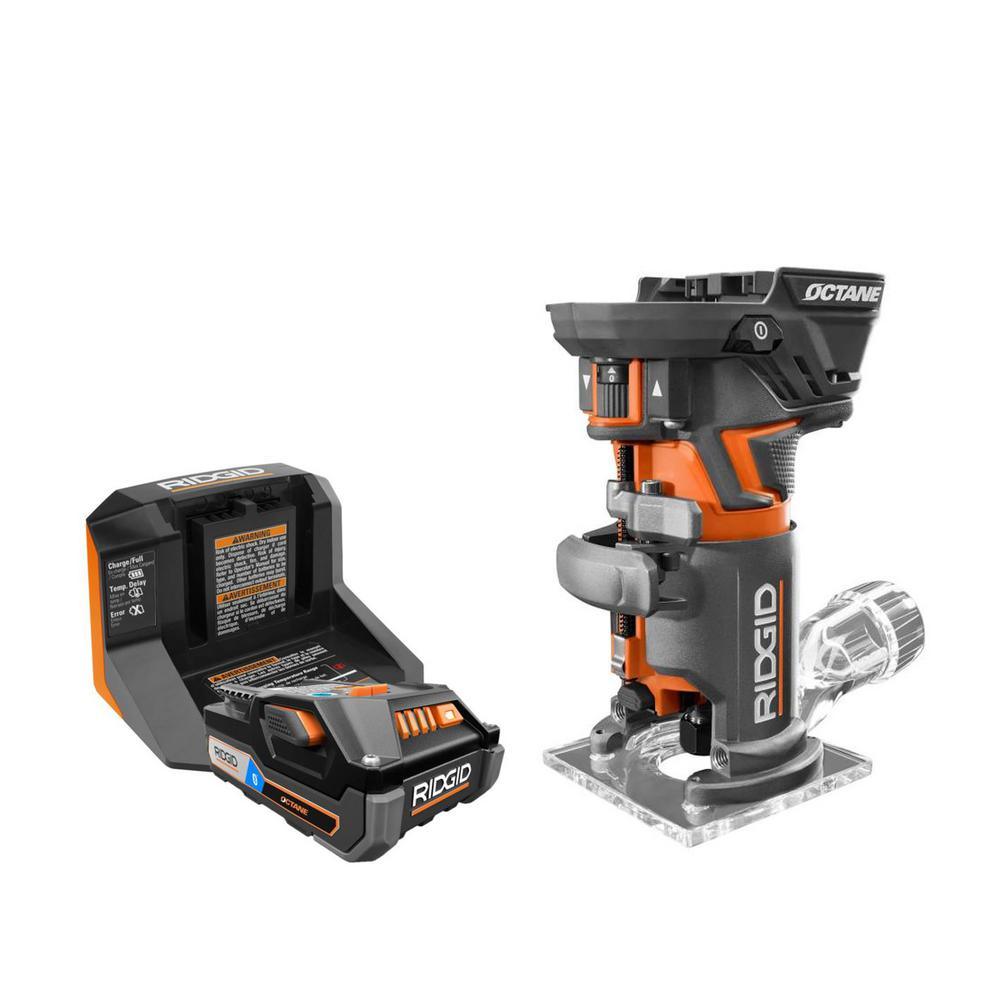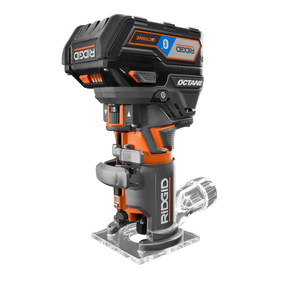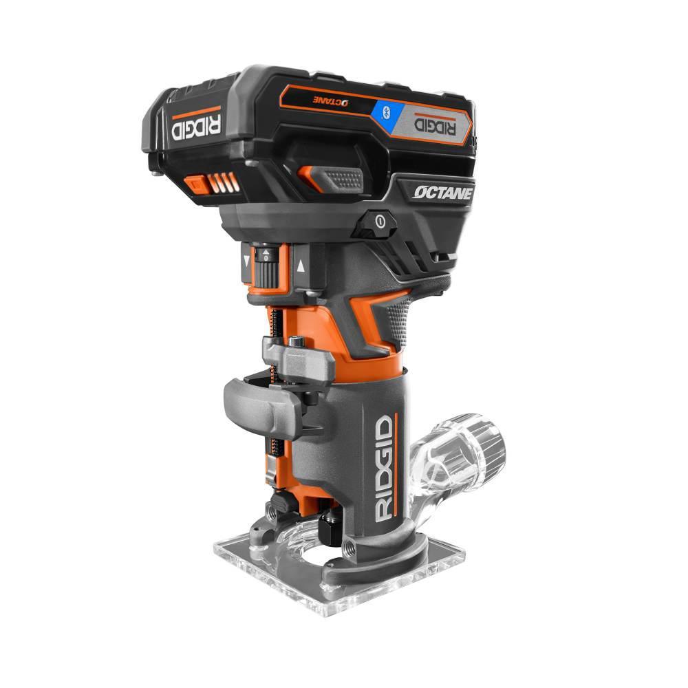 RIDGID introduces the 18-Volt OCTANE Cordless Brushless Compact Fixed Base Router Kit with (1) OCTANE Bluetooth 3.0 Ah Battery and Charger. The OCTANE Brushless Compact Router features high performance brushless motors and advanced electronics that provide best-in-class power and intelligence. While providing increased performance with all RIDGID 18-Volt batteries, OCTANE tools provide maximum performance in high demand applications when paired with OCTANE batteries. Paired with an OCTANE battery, this tool delivers up to 15% more power than the previous model, making it perfect for DIY jobs around the house and for professionals. The battery in this kit offers 2X more runtime when compared to standard 1.5 Ah lithium-ion. With Bluetooth Technology, the jobsite is opened up to many features that will increase productivity throughout the work day. While providing increased performance with all RIDGID 18-Volt tools, OCTANE batteries provide maximum performance when paired with OCTANE tools for high demand applications. The 18-Volt Charger is compatible with all RIDGID Batteries. With registration, this tool is backed by the Industry's Only Lifetime Service Agreement, and includes a square and a round base, a detachable dust port, an edge guide, a 1/4 in. bit, a collet wrench, a 3.0 Ah OCTANE Battery, an 18-Volt Charger, and an operator's manual.