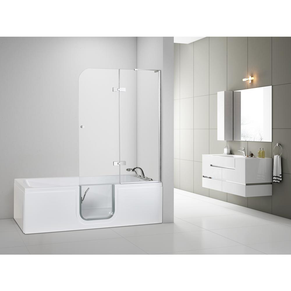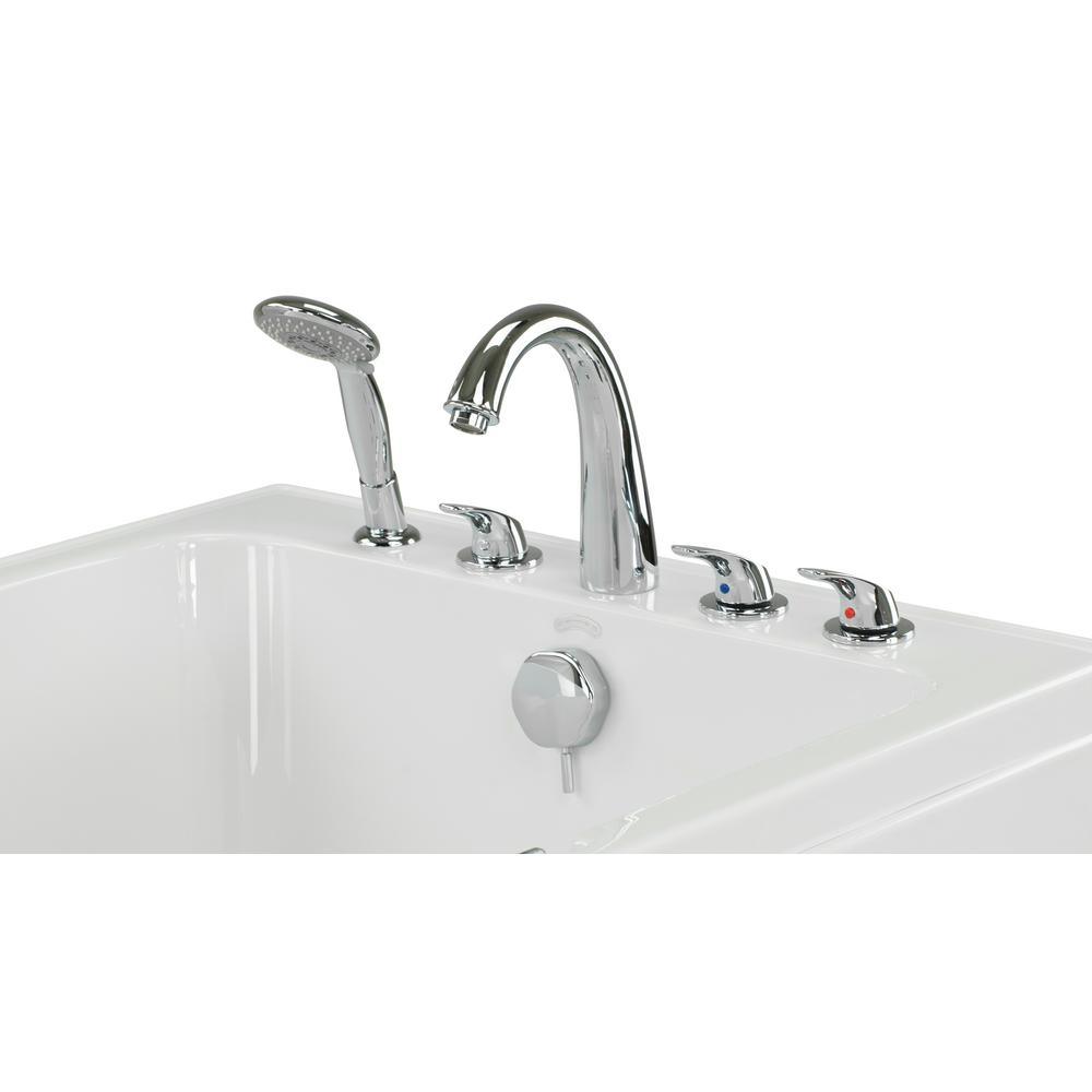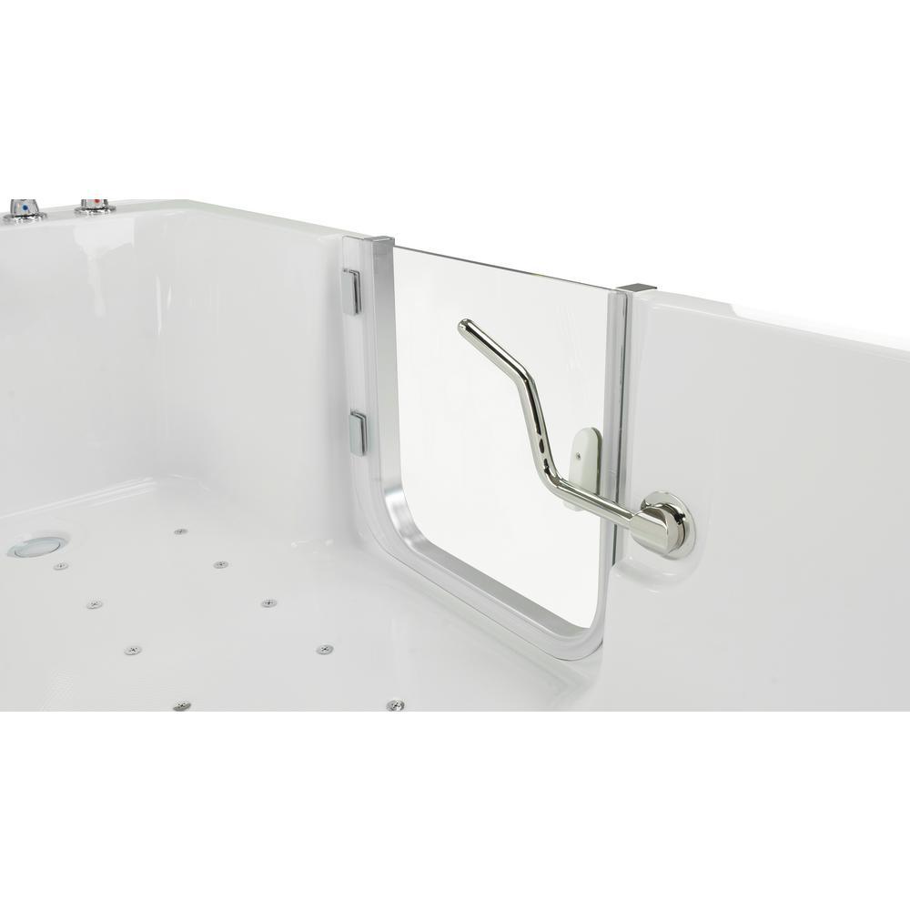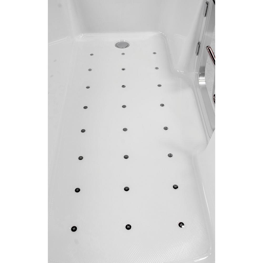 The spacious Ella Laydown 32x72 in. air massage acrylic walk-in bathtub comes equipped with 24 salt and pepper shaker style air jets on the floor of the tub, 3 speed and pulse settings, on/off push control, auto purge, glass shower screen and a unique tempered glass inward swing door with a brushed finish aluminum door frame. Each salt and pepper style jet has 5 micro holes that create a soothing bathing experience. Also included is a 5-piece fast fill faucet set with retractable hand shower. 3/4 in. supply lines offer faster fill times (up to 18 GPM at ideal in-home plumbing conditions) than the 1/2 in. supply lines that are more commonly used in our competitors' bathtubs. This step-in bathtub provides you with all the accessibility and safety of a traditional walk-in tub, while offering you the comfort and feel of a traditional bathtub. Engineered straight and narrow side walls offer unparalleled safety while maximizing interior space for your comfort. Designed with your safety in mind, this tub features a wider flat floor space side to side so that you can stand closer to the wall of the tub greatly reducing your chances of slipping and tripping when standing in, showering, and entering or exiting the tub. The gravity driven 2 in. drain, complete with overflow and opener, ensures quick drain times vs. the typically used standard 1-1/2 in. drain, so that you can exit the tub quickly and safely.
