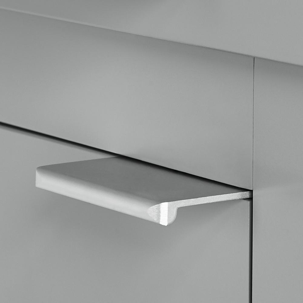 • Features clean, white finish, modern, horizontal grooves and silver cabinet handles