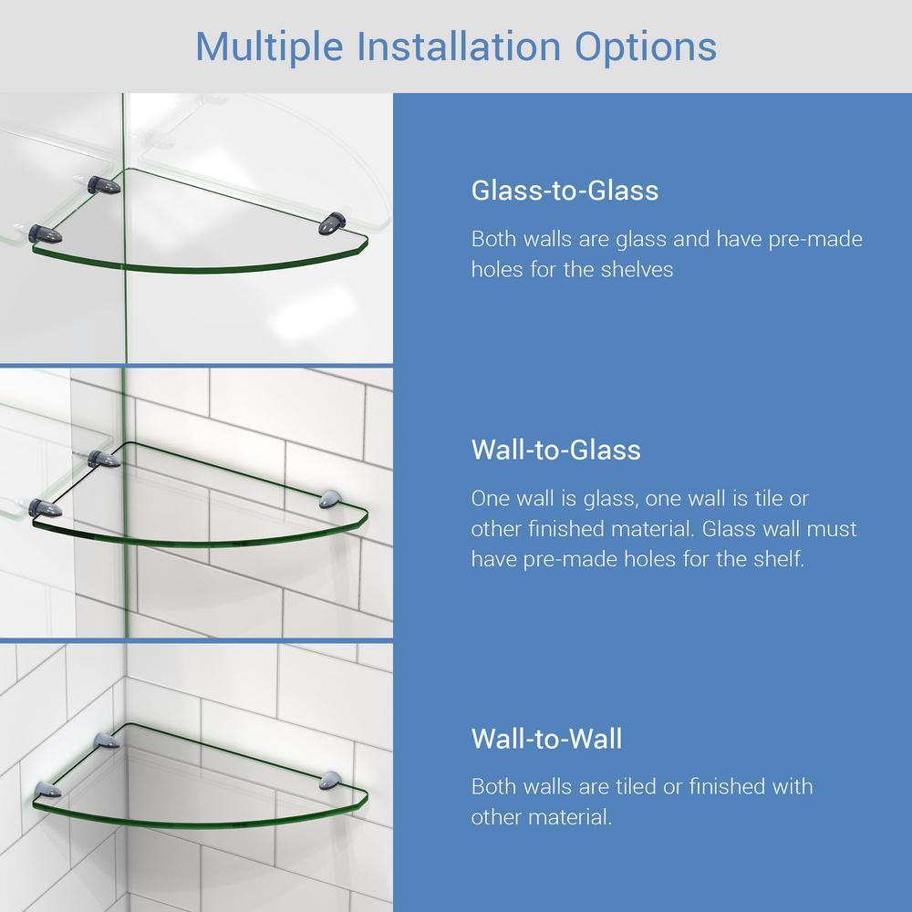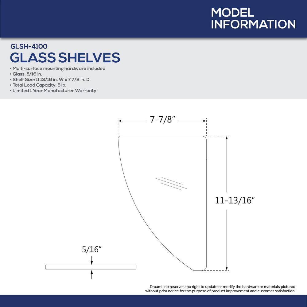 Brighten up your shower space with elegant glass shelves from DreamLine. Durable 5/16 in. thick glass shelf is supported by stainless steel brackets available in 4 finishes to coordinate with any bathroom decor. The discreet mounting hardware allows for quick installation to glass, tile, or drywall. Choose DreamLine for the ultimate solution for your shower project.