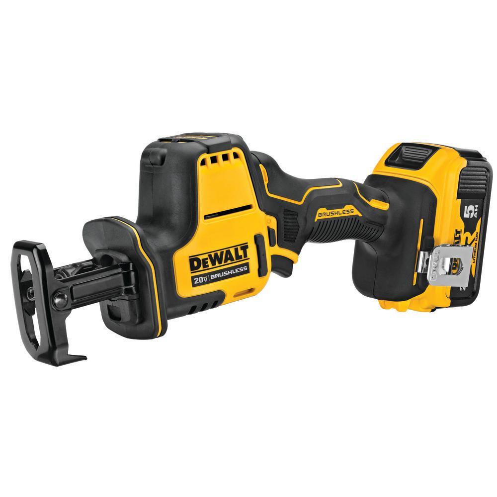 This cordless 1-handed reciprocating saw is lightweight at only 3.13 lbs. and 37% lighter than the DCS367 Compact Reciprocating Saw (Tool Only). It is equipped with an LED to help illuminate dark workspaces and provides up to 2,800 spm to help get the job done. The pivoting shoe and variable speed trigger provide added control for a variety of jobs. This kit includes one 20-Volt MAX* 5.0 Ah battery, charger, belt hook, tool bag and 2 blades.