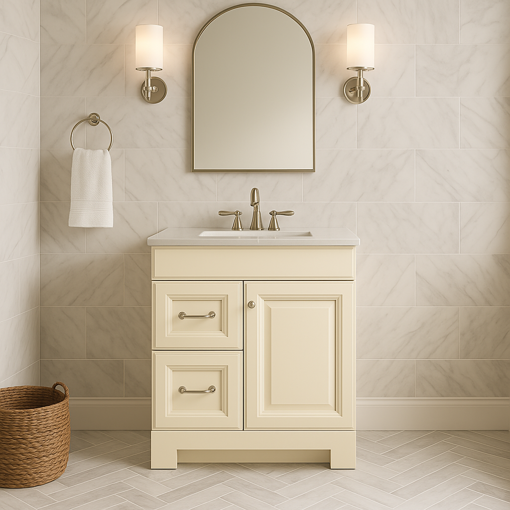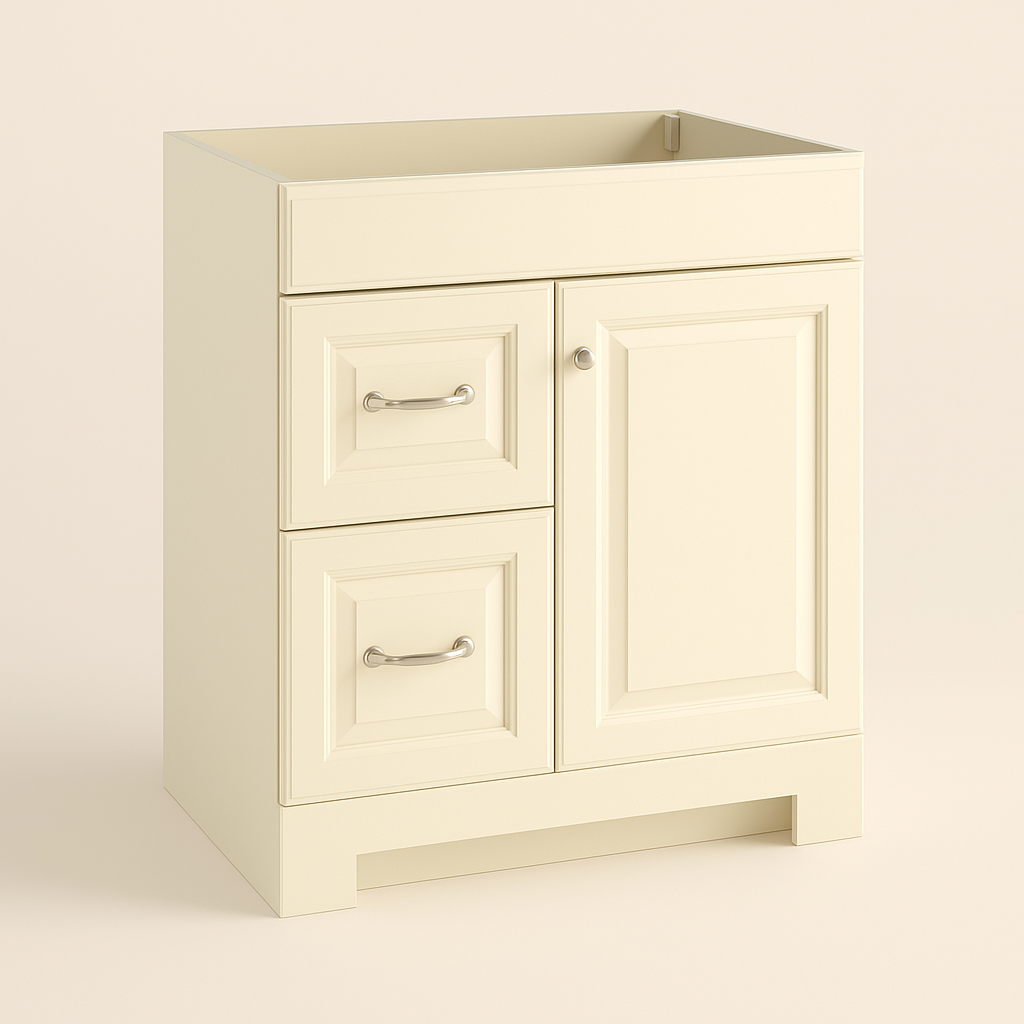 The Brinkhill Vanity Cabinet by Home Decorators Collection combines timeless design with practical storage solutions. Featuring a cream finish, polished nickel hardware, and soft-close hinges, this cabinet is perfect for enhancing any bathroom.