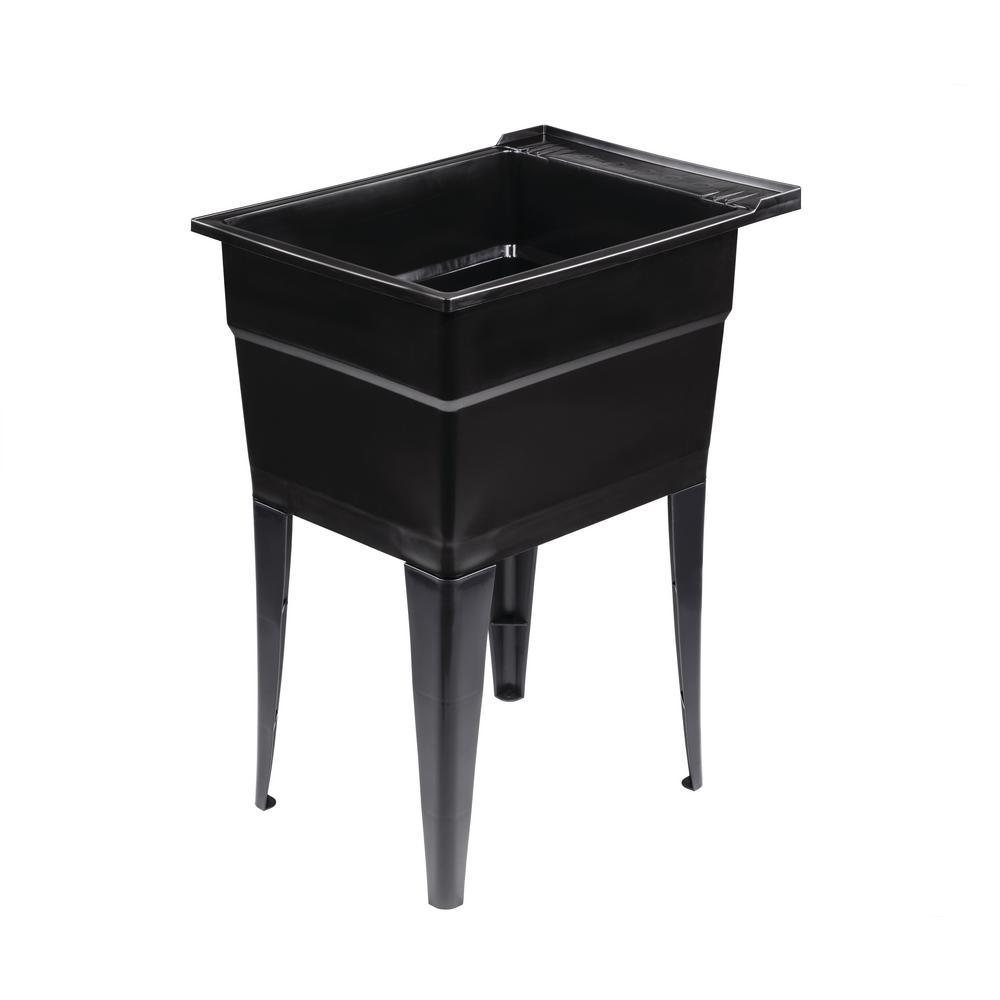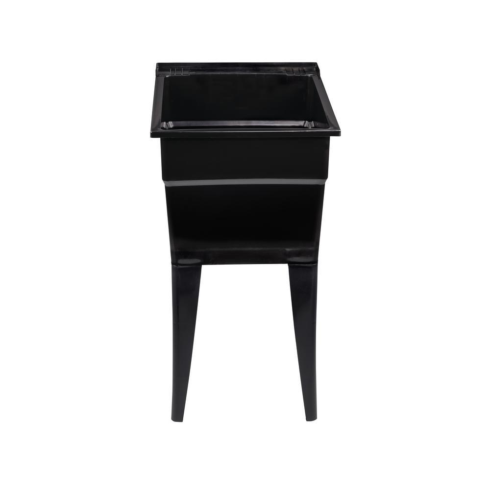 Narrow 18 in. Black laundry tub with two integrated soap dishes and four legs designed to support two shelves. Black laundry tub made of 100% recycled material. Non rust adjustable feet/legs.
