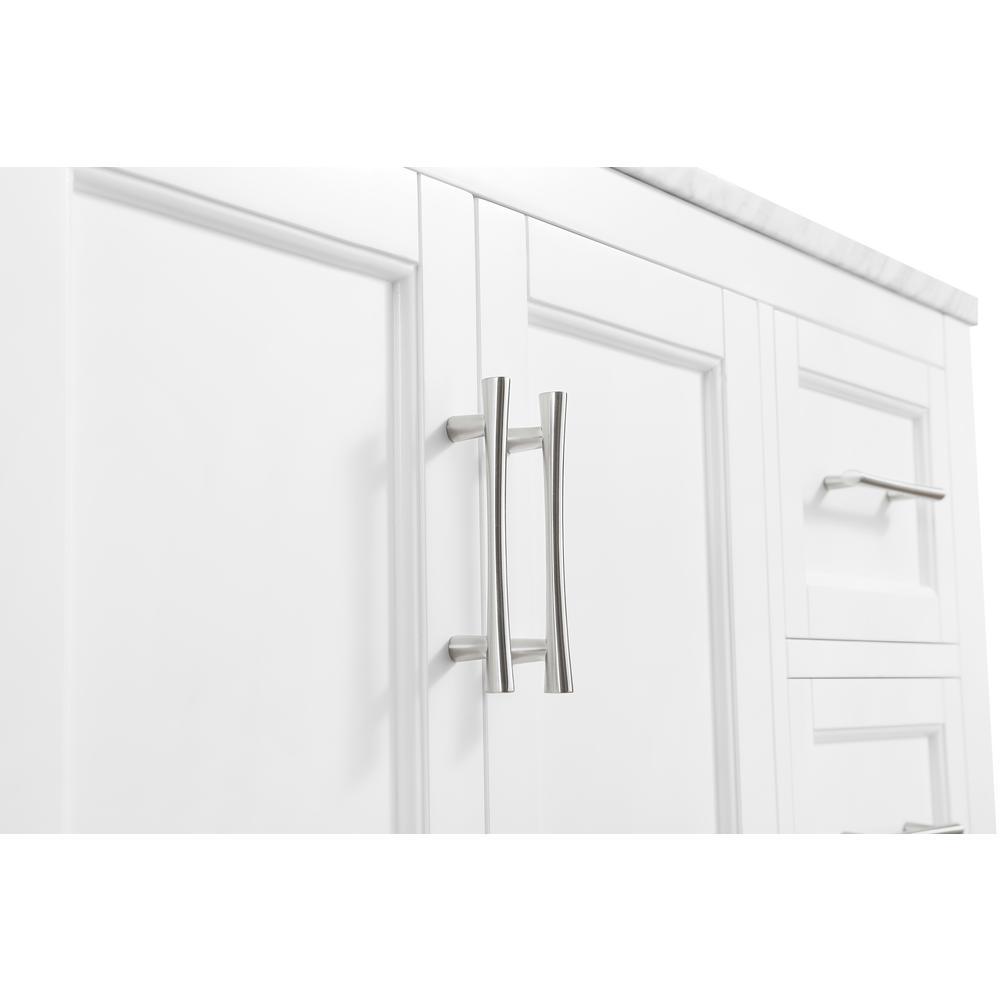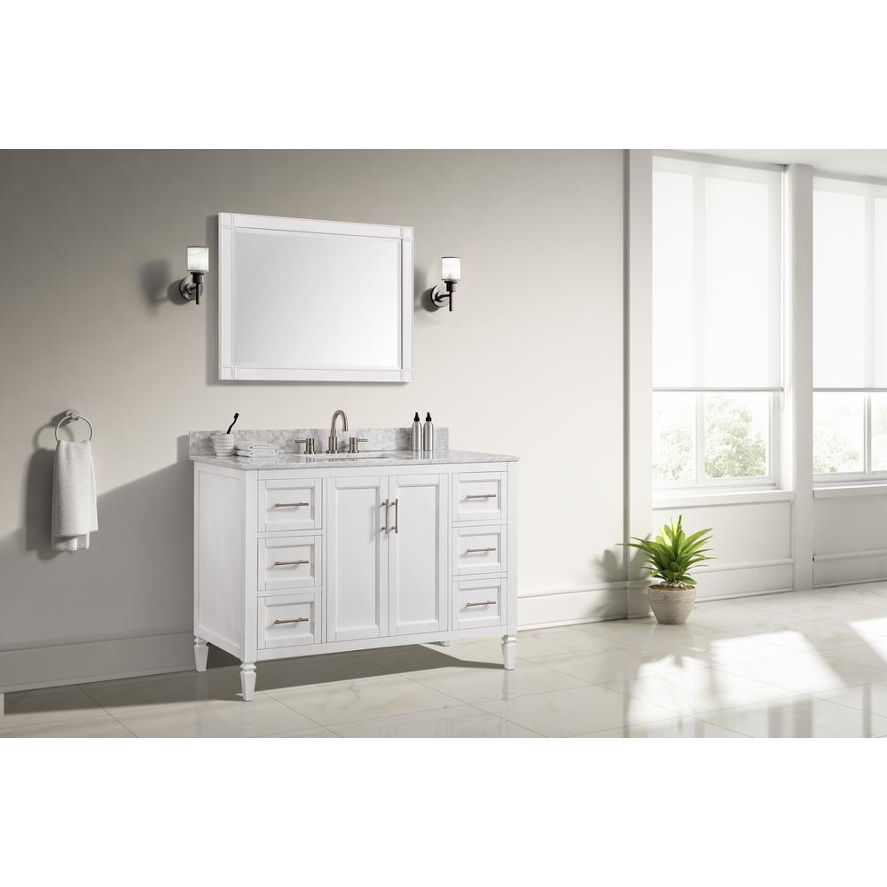 The Stockham 48 in. cabinet brings beauty to your bathroom. Corner blocking and a solid wood frame ensure durability. The white finish, brushed nickel hardware, and flat panels provide tasteful details that will complement multiple design decors. Soft-close glides and hinges keep things quiet. Pair it with the top of your choice and the matching mirror to create the cornerstone of your bathroom.