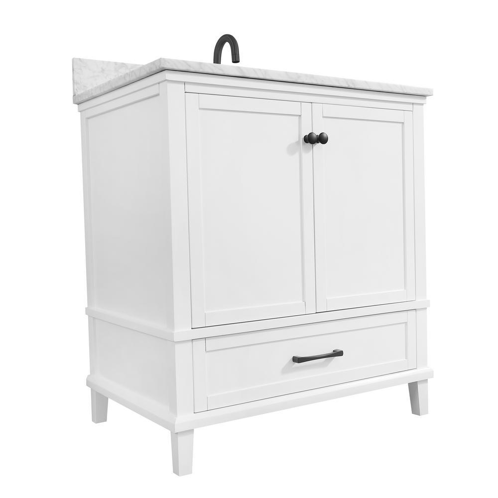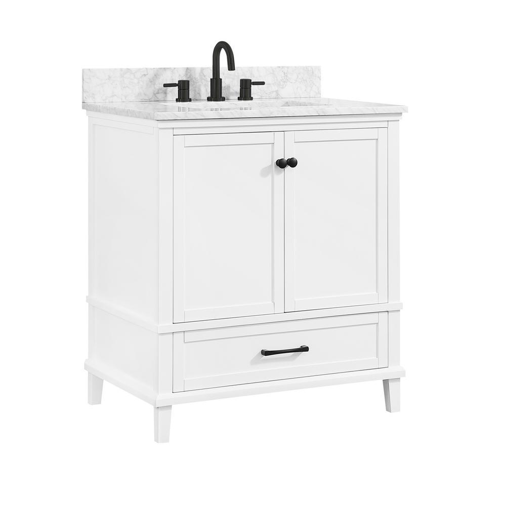 Restore beauty to your bathroom with the Merryfield 31 in. Bath Vanity in White. A pristine Carrara white marble top and rectangular undermount sink top off the handsome cabinet, which features simple lines and subtle styling. Black finish hardware, solid wood frame, soft-close glides and hinges, and adjustable shelf speak to superior construction. Combine it with the matching mirror or mirror cabinet and linen tower to create an elegant ensemble.