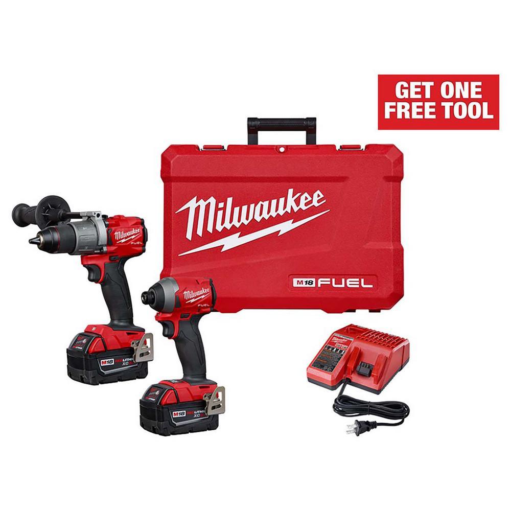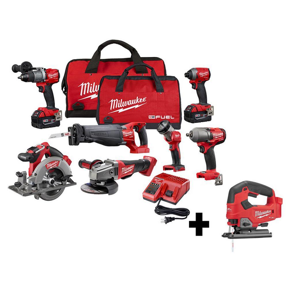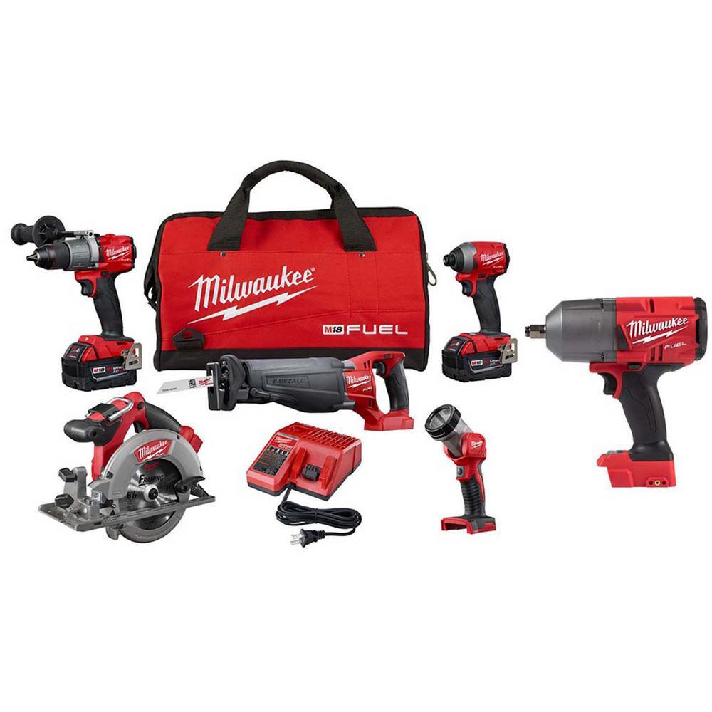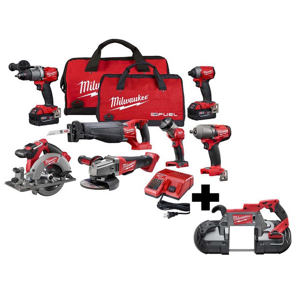 - Includes: M18 FUEL 1/2 in. hammer drill (2804-20), M18 FUEL 1/4 in. Hex impact driver (2853-20), M18 FUEL SAWZALL reciprocating saw (2720-20), M18 FUEL 6-1/2 in. circular saw (2730-20), M18 LED work light (2735-20), (2) M18 REDLITHIUM XC5.0 battery, (1) M18 & M12 multi-voltage charger, (1) 6 in. 18 TPI thin-kerf blade, (1) circular saw blade, (2) belt clips, (2) bit holders, (1) contractor bag, (1) 2729-20 M18 FUEL deep cut band saw, (1) bandsaw blade