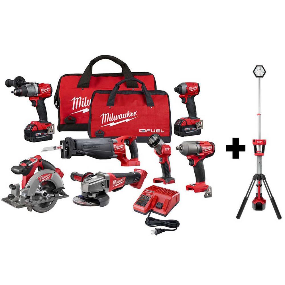 The Milwaukee M18 FUEL 6-tool combo kit delivers the most advanced 18-Volt cordless drilling, fastening and cutting technology in the industry. This kit features 5 M18 FUEL 18-Volt Lithium-Ion brushless cordless tools including a ½ in. hammer drill, ¼ in. impact driver, SAWZALL reciprocating saw, 6-1/2 in. circular saw and LED work light. M18 FUEL is fully compatible with the Milwaukee M18 18-Volt cordless system, featuring over 175 plus tools. M18 FUEL features the most advanced cordless technology in the industry, a POWERSTATE Brushless Motor, REDLINK PLUS Intelligence and REDLITHIUM Battery Technology, resulting in longer motor life, longer run time and more power. 2767-20 M18 FUEL high torque impact wrench with friction ring eliminates the need to use a pneumatic tool for those stubborn and rusted bolts by delivering 1,000 ft./lbs. of fastening torque and 1400 ft./lbs. of nut-busting torque. With 2X faster removal speed, users will be able to get the job done faster and be more productive throughout their day.
