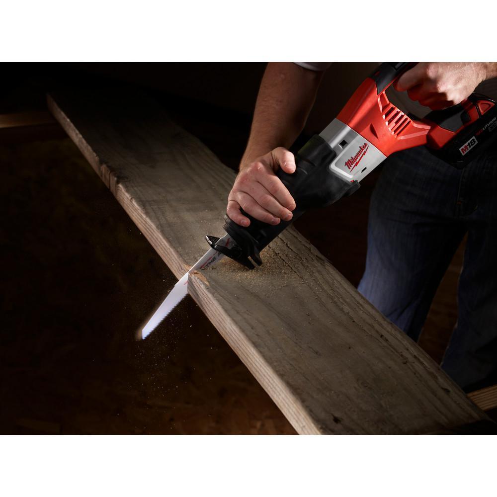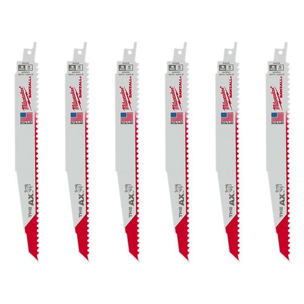 The Milwaukee AX SAWZALL Blades utilize innovative NAIL GUARD technology for 2X faster cuts, 5X longer lifespan, and exceptional tooth durability, making them the top choice for wood demolition. The FANG TIP design allows for quick plunge cuts into all types of wood, including those embedded with nails, increasing the versatility of these blades. The thicker, more rigid blade body enhances durability and resists fracturing and bending in even the toughest applications. With a 1 in. tall blade body, these blades reduce twisting and provide straighter, more precise cuts. This pack includes 5 blades with a 1/2 in. universal tang, perfect for demolition.
