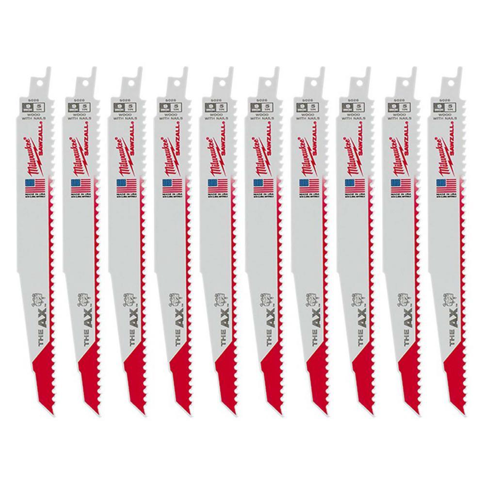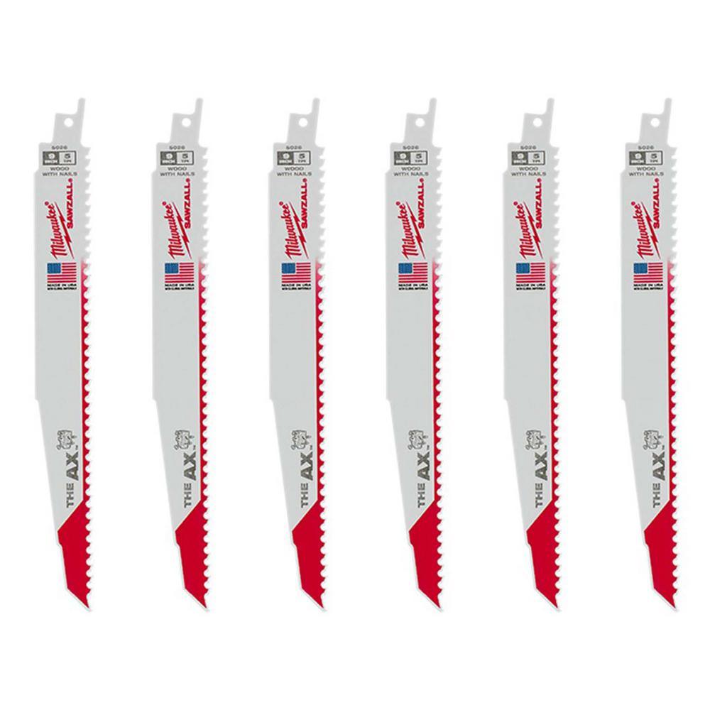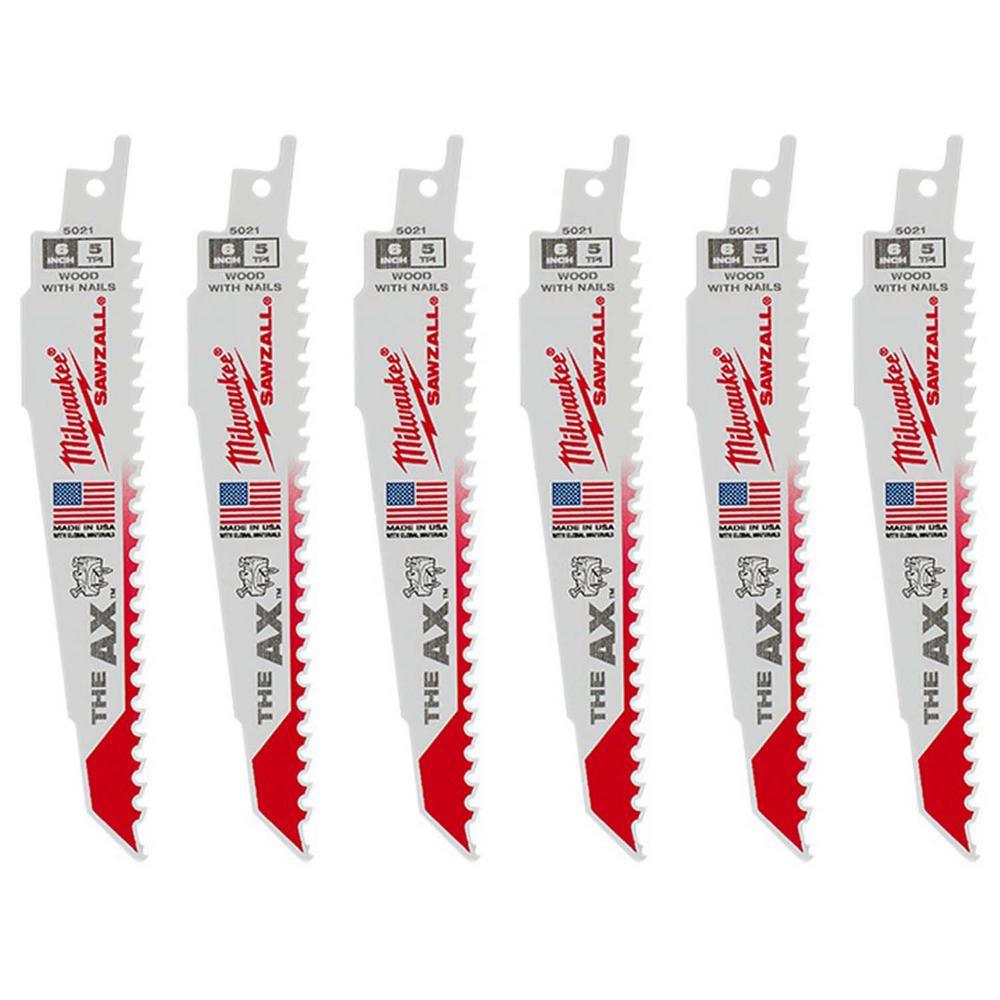 These AX SAWZALL Blades are designed using Milwaukee NAIL GUARD technology to provide 2X faster cuts, 5X longer life and the highest level of tooth durability for wood demolition blades currently available. The innovative FANG TIP allows for swift plunge cuts in wood and nail-embedded wood, increasing versatility. With a thicker and more rigid blade body, these SAWZALLS can withstand the toughest applications without fracturing or bending. The 1 in. tall blade body reduces twisting, resulting in more accurate cuts. Each pack includes 5 blades with a 5 TPI count for fast and aggressive cuts. Trust the 1/2 in. universal tang for demolition jobs.