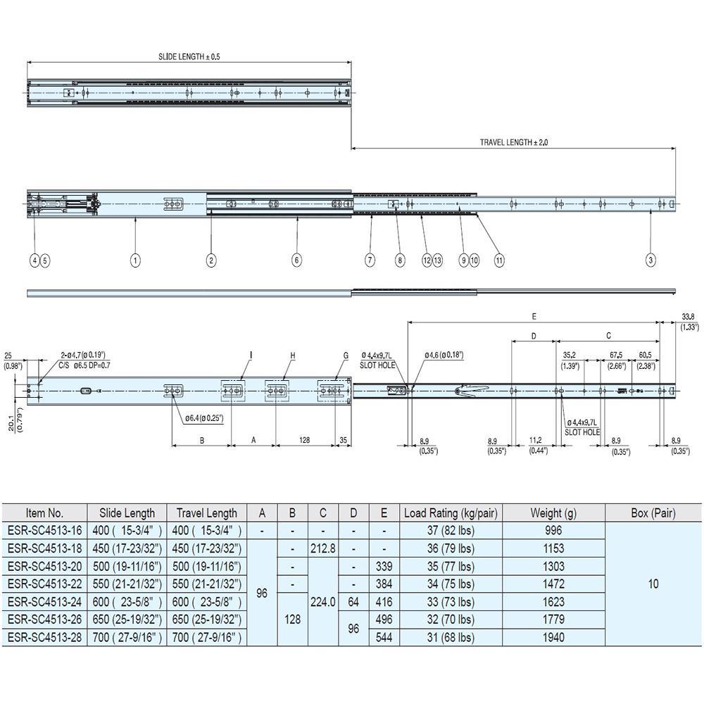 • Actual slide spec dimension 600 mm (23-5/8 in.) L x 12.7 mm (1/2 in.) W x 44.7 mm (1-3/4 in.) H