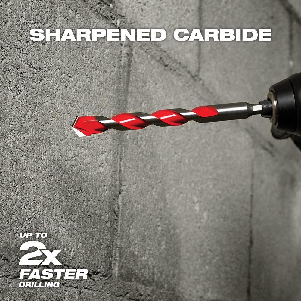 The Milwaukee 5-Piece SHOCKWAVE Carbide Hammer Drill Bit Kit uses sharpened carbide to deliver up to 5x longer life in concrete and up to 2x faster drilling into masonry materials. Engineered with a precision ground tip, these bits deliver faster starts and less walking in concrete, brick and block. The carbide-tipped masonry drill bits' wide flute design removes dust faster, reducing heat and delivering more holes per charge. Equipped with a 1/4 in. Hex Shank, Milwaukee SHOCKWAVE Carbide Hammer Drill Bits are the ideal solution for drilling in masonry materials with both impacts and hammer drills/drivers. This drill bit kit includes one 5/32 in., one 3/16 in., one 1/4 in., one 5/16 in. and one 3/8 in. hammer drill bits.