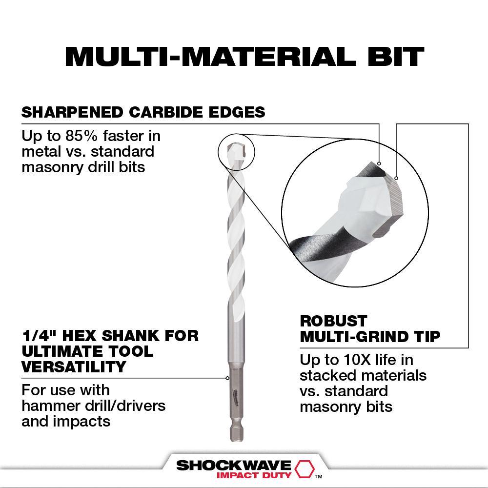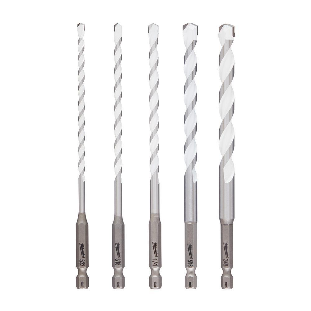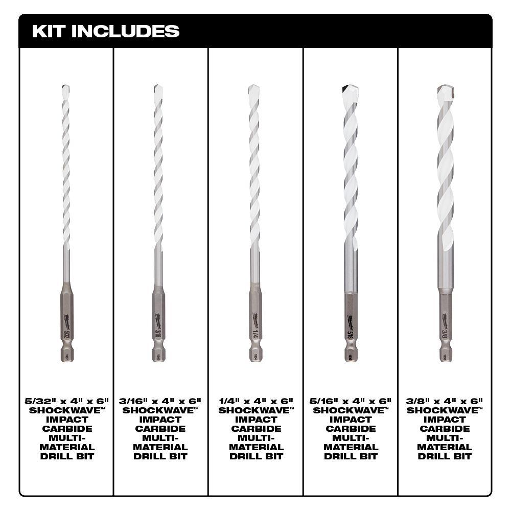 The Milwaukee 5-Piece SHOCKWAVE Carbide Multi-Material Drill Bits are the most versatile bits, designed to tackle a variety of materials, including brick, block, concrete, steel, aluminum, ceramic tile, backerboard, wood, PVC and drywall. The aggressive multi-grind carbide tip delivers up to 10X longer life in stacked materials and up to 85% faster drilling speeds in metal. Equipped with a 1/4 in. hex shank, these all-purpose drill bits are compatible with impacts, drill/drivers and hammer drills. These Milwaukee general-purpose drill bits provide the ideal all-in-one solution for the widest variety of materials, tools and applications. This kit incudes one 5/32 in., one 3/16 in., one 1/4 in., one 5/16 in. and one 3/8 in. SHOCKWAVE Carbide Multi-Material Drill Bits.