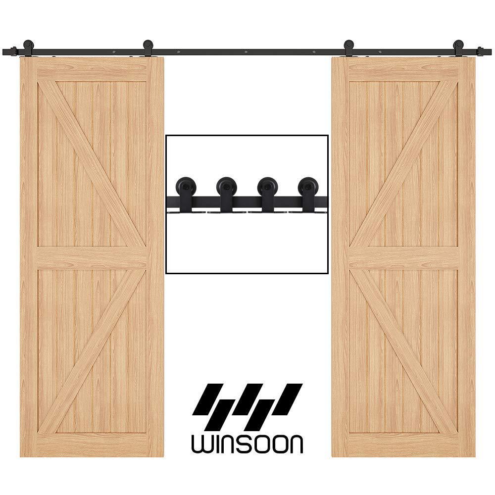 Keep your barn doors rolling easily and quietly with this WINSOON 10 ft./120 in. Top Mount Sliding Barn Door Hardware Track Kit in Frosted Black. Balanced hangers keep the weight even on the wheels for smooth operation. A precision, solid carbon steel extruded track adds durability and guarantees that the doors will not jump track. Includes door stoppers to set the exact sliding range. The strong floor guide stabilizes door movement. Kit is for double doors 1-3/8 in. and 1-3/4 in. thick, up to 230 lbs. Doors are not included.