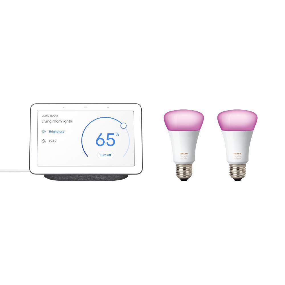 Nest Hub Charcoal and 2-Philips Hue White and Color Ambiance A19 LED Dimmable Smart Wireless Light Bulb