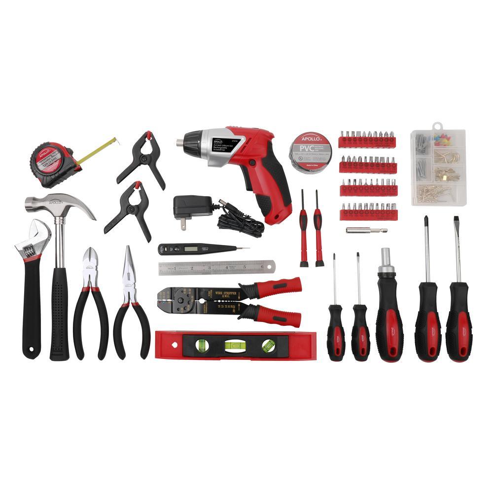 Apollo Tools 161-piece Household Tool Kit includes a powerful 3.6 volt rechargeable cordless screwdriver with an upgraded Lithium-Ion battery. The easy-to-carry heavy-duty blow molded case has a snap-in feature to securely hold tools in organized spaces. The set contains a careful selection of tools typically used for home repairs, maintenance and improvement projects such as DIY plumbing and electrical, arts and crafts projects. In addition to the 3.6 volt cordless rechargeable screwdriver with UL charger, this set contains: 8.5 in. Wire Crimper/Stripper, Slotted 1/4 in. x 4 in. Screwdriver, Phillips # 2 x 4 in. Screwdriver, 8 oz Claw Hammer, Forty 1 in. Bits, 6 in. Diagonal Pliers, 6 in. L Nose Pliers, 12 ft. Measuring Tape, Electric Voltage Tester, Ratcheting Bit Driver, 2 in. Magnetic Bit Extension, Electrical Tape, Slotted 1/8 in. x 3 in. Screwdriver, 8 in. Adjustable Wrench, Phillips # 0 x 3 in. Screwdriver, 3 in. Spring Clamps, 9 in. Magnetic Level, 6 in. Stainless Ruler, Slotted 3.0 mm Precision Screwdriver, Phillips # 1 Precision Screwdriver, 100 Piece Fastener Set.