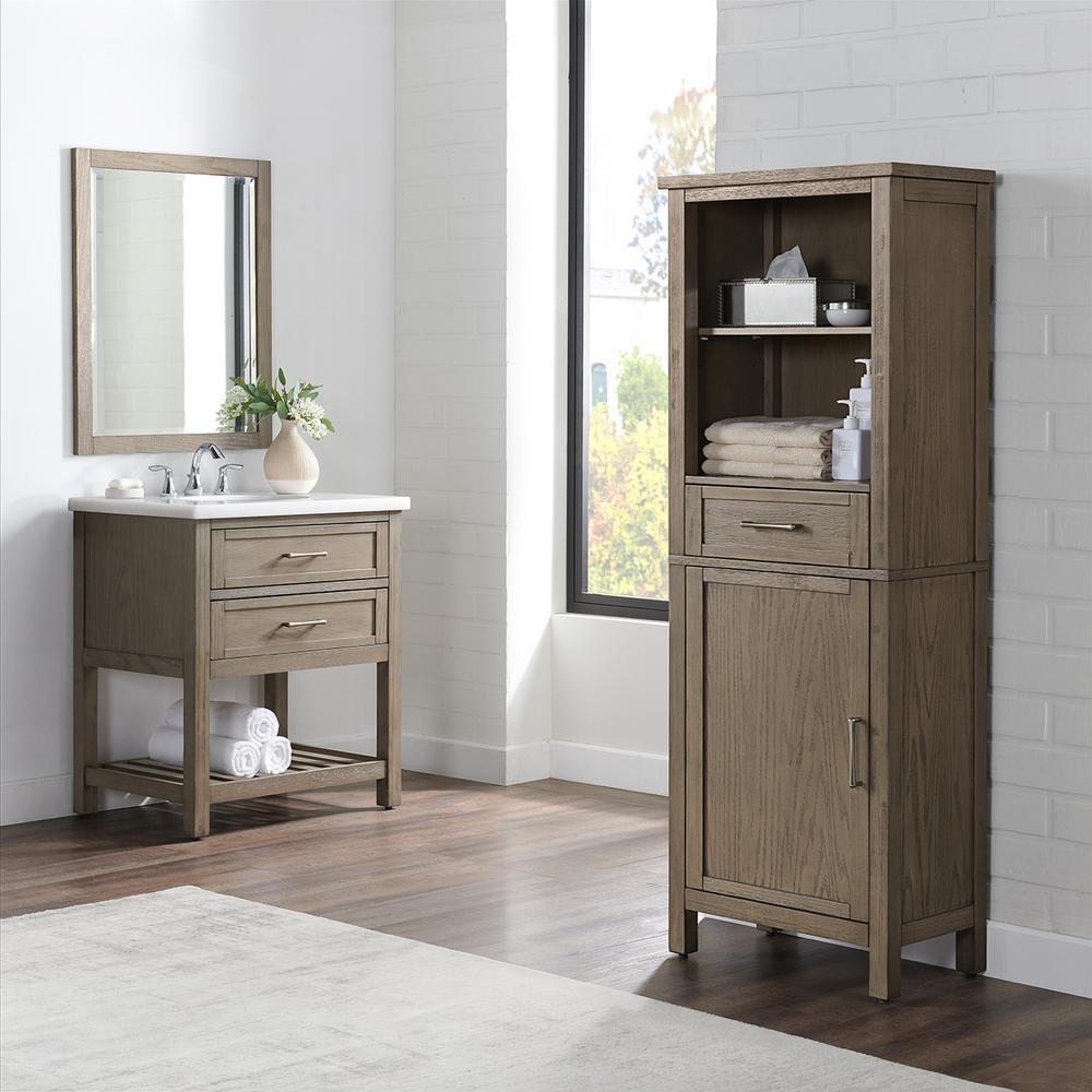 The Wimsbury 24 in. linen cabinet combines function with tradition. The linen cabinet is designed with straight lines and finished in weather oak. It is constructed of solid rubber wood and MDF. It features one drawer, one open shelf and a small cabinet with a door to accommodate all your storage needs.