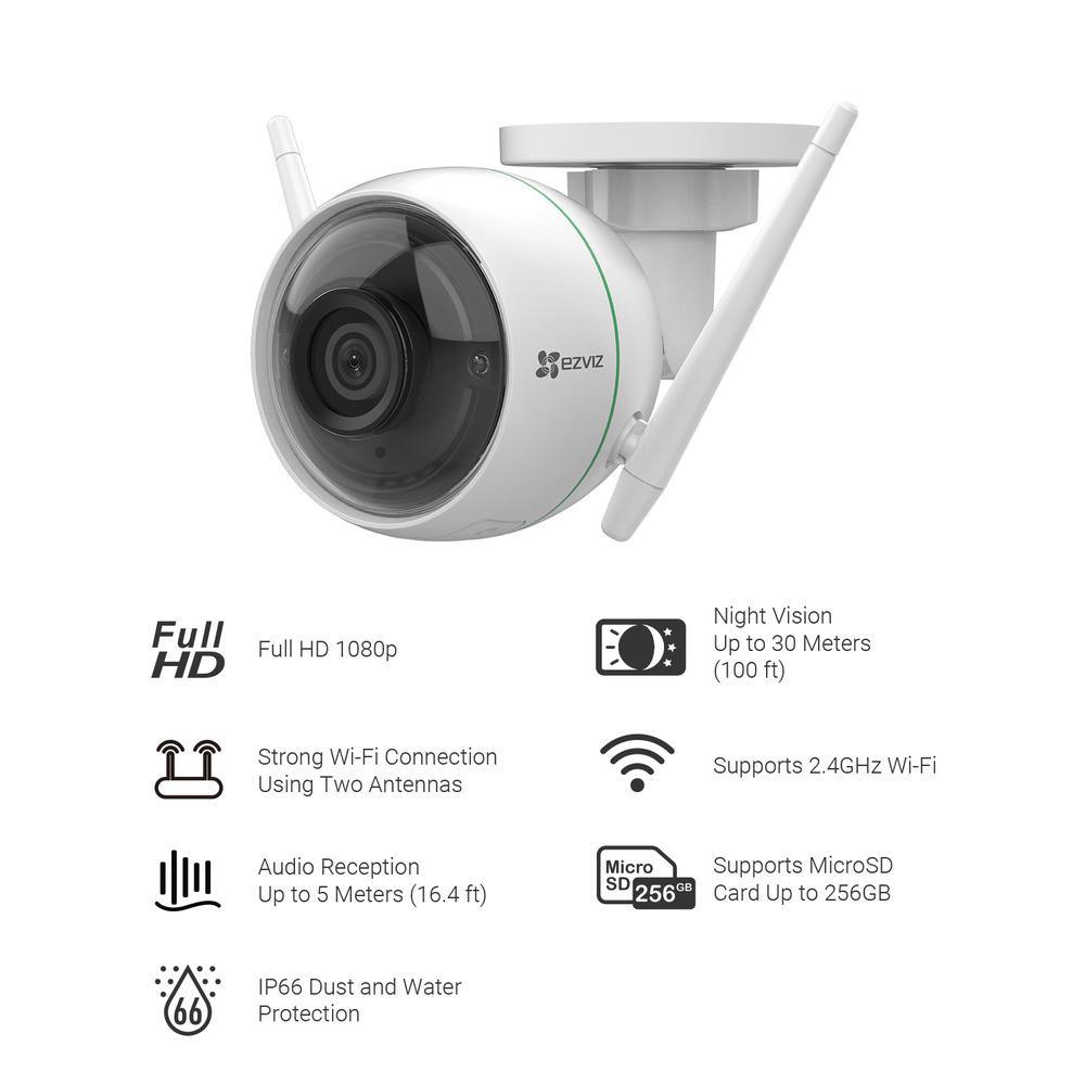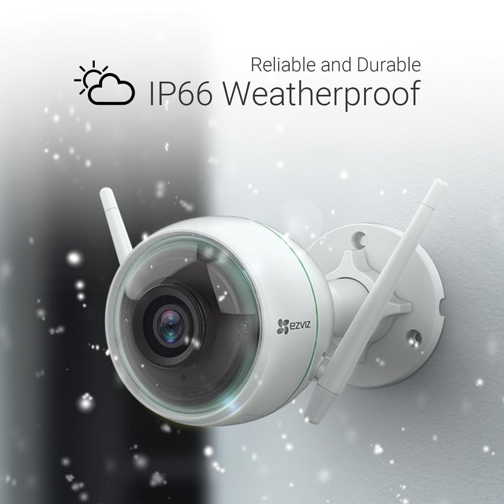 The EZVIZ C3WN WiFi Outdoor Security Camera features dual WiFi antennas that help keep the camera reliably connected while looking out for your property. With 1080p high definition video resolution, 1-way audio capability, and smart motion detection configurations, this entry-level outdoor smart security camera is an ideal addition to any home, without breaking the bank. This EZVIZ WiFi security camera also has a microSD card slot for onboard storage of recordings. No more monthly Cloud subscription fees necessary with EZVIZ! Please note that WiFi cameras are not wire free and require a power outlet. That's why this camera comes with a 5 ft. power adapter. The camera is designed to work with your home's WiFi to transmit video and audio to the downloadable app—without the use of wires. But if for some reason your home's WiFi isn't strong enough to capture the camera's signals or you prefer hardwired signals, an Ethernet port is on the camera itself. This is why a waterproofing kit is provided, so you can hardwire this outdoor camera directly to your Ethernet router inside your home, using your own Cat-5 cabling.