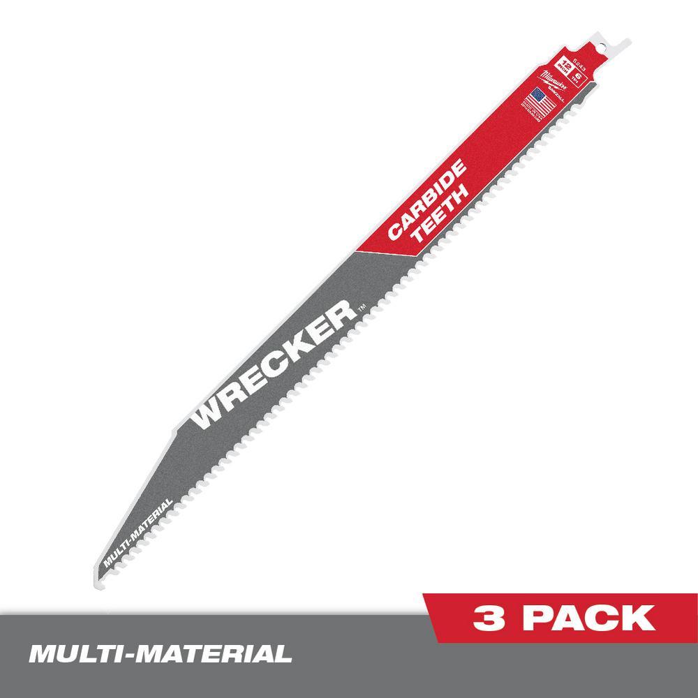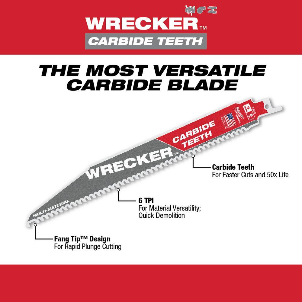 The Milwaukee 9 in. 6 TPI WRECKER with Carbide Teeth SAWZALL Blade is the most versatile carbide blade on the market. These multi-material SAWZALL blades offer up to 50X more life verses bi-metal reciprocating saw blades available today. The Milwaukee WRECKER blade offers a 6 TPI design, which allows for cutting into a wide variety of materials from clean wood to cast iron for quick demolition and remodeling work. The Fang Tip Design allows for faster plunge cuts into wood materials. Milwaukee Carbide Teeth products allow users to cut longer, cut more and cut faster than other carbide-teeth blades on the market.