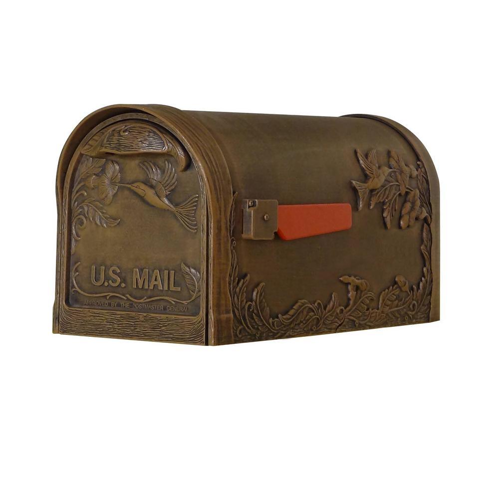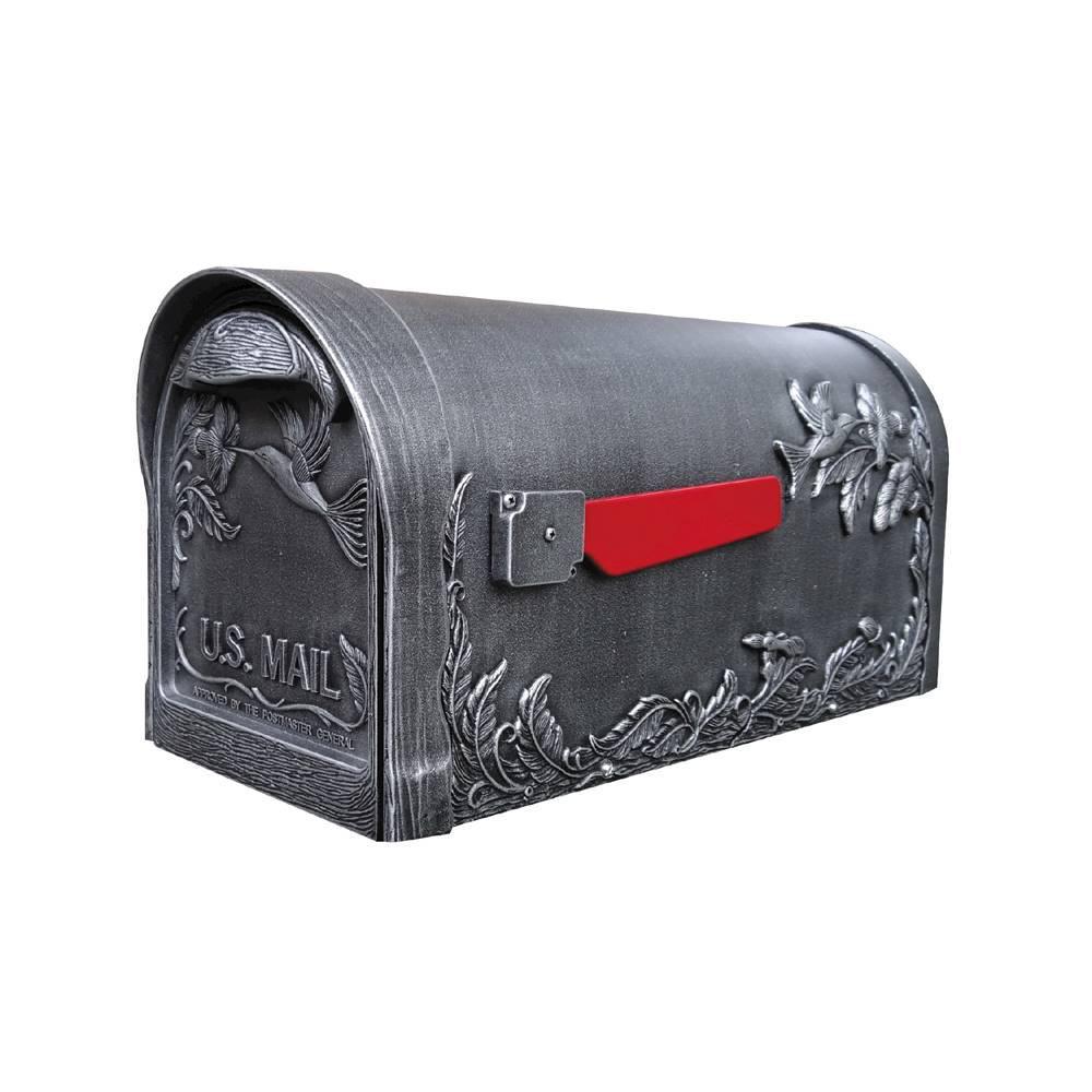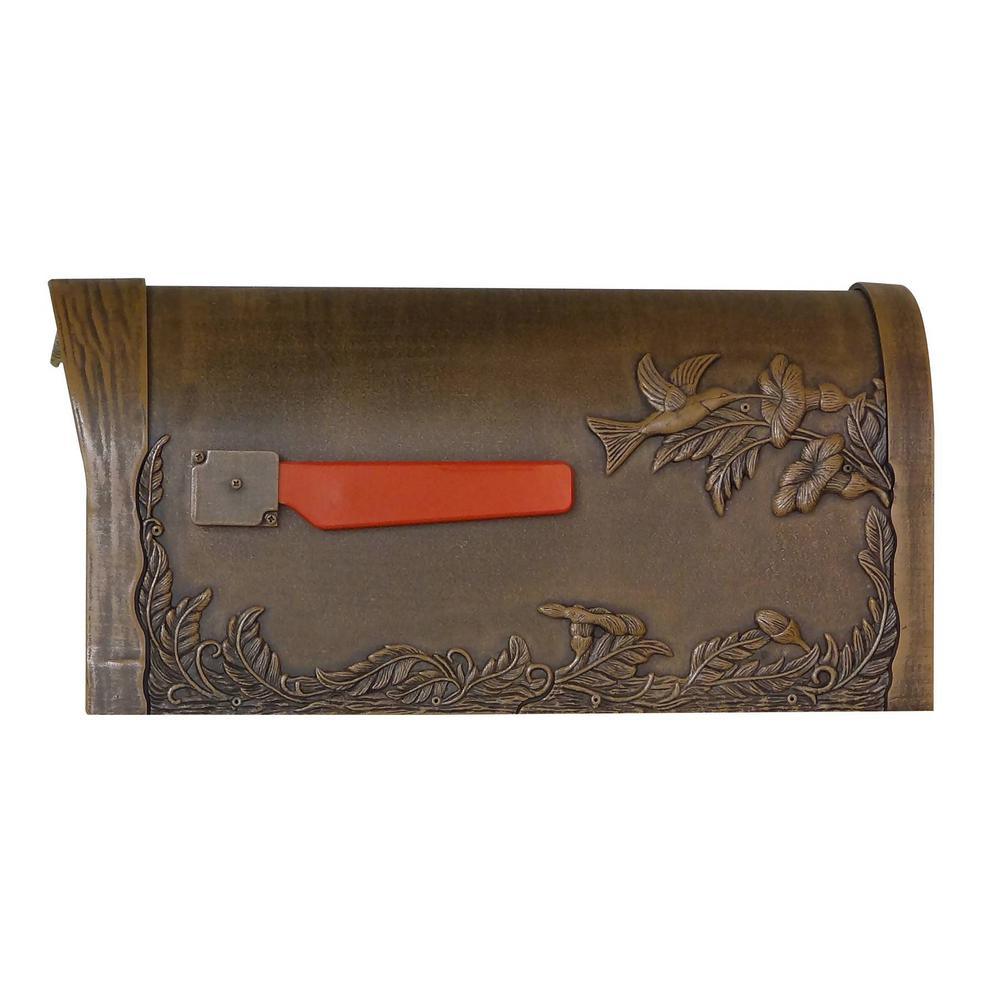 A rare find. The striking Hummingbird design on both sides of this mailbox appears to take flight right off the mailbox. The craftmanship of the deeply embossed designs show your love of nature and gives a charming appearance suitable for either a country or suburban home. If you are looking to make a breathtaking impression in your neighborhood while also bringing a stunning addition to your home, the Hummingbird design is for you. The stainless-steel spring hinge and strong magnetic door latch will keep the door secure while the rust proof cast aluminum, powder coated body construction creates a weather resistant mailbox. The cup-shaped door handle blends beautifully but remains fully functional. Larger than a standard mailbox, the Hummingbird will fit your important mail, documents, packages and keep them dry. The housing around the die cast flag is finished to match the body and will ensure the flag to stay upright and signify pickup at your mailbox. The Hummingbird is more than a mailbox, it's a piece of art and 1 you can enjoy for a lifetime.