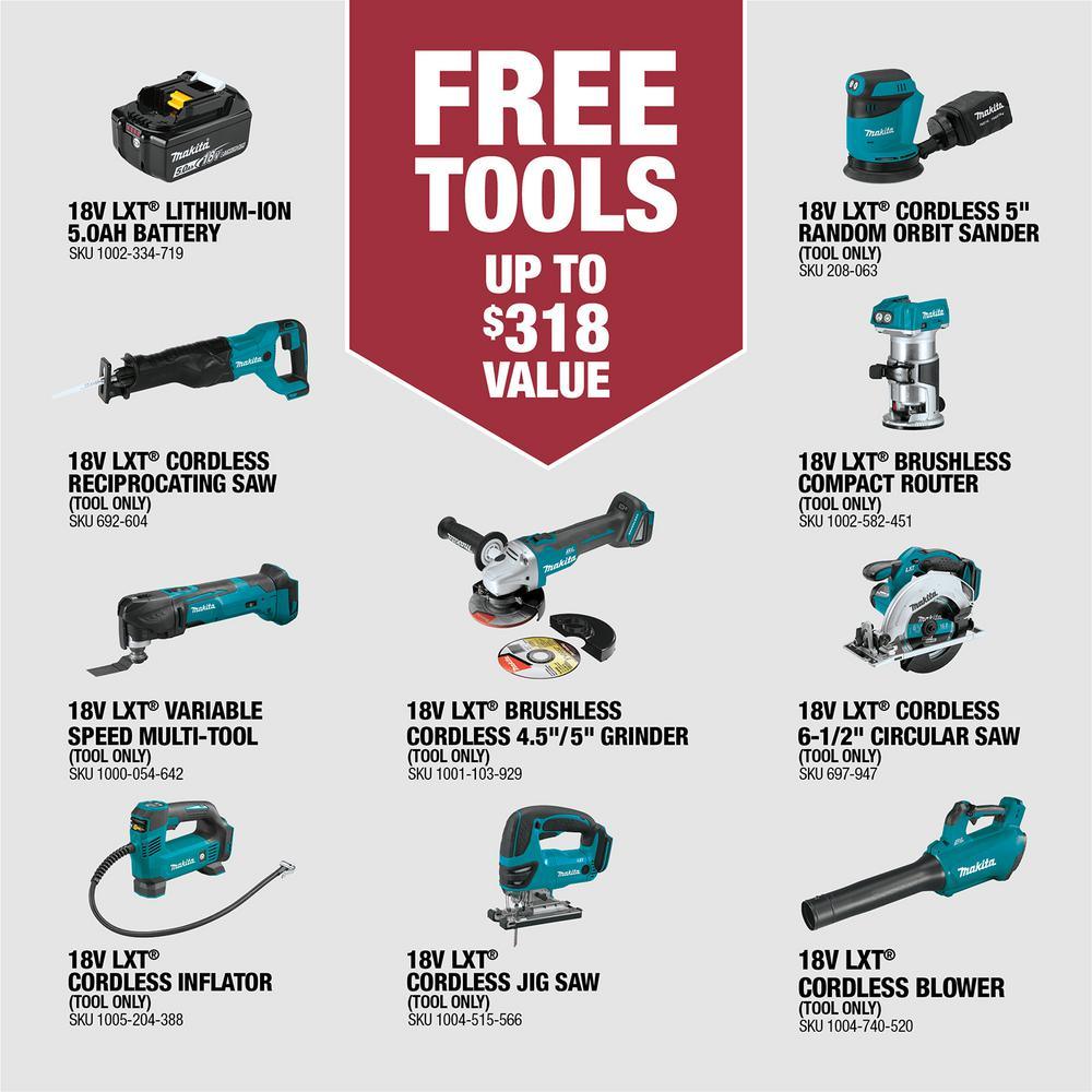 Build your own Makita tool kit with the 18-Volt Lithium-Ion Battery and Rapid Optimum Charger Starter Pack. Makita offers over 225 cordless tools that utilize 18-Volt lithium-ion batteries, most available as bare tools (tool only, no batteries or charger included). Pick up the Makita Battery and Rapid Optimum Charger Starter Pack, then purchase the 18-Volt bare tools you need to get the job done. It's an ideal way to start building a Makita LXT Cordless System. Makita 18-Volt Lithium-Ion Batteries resist self-discharge, so theyre ready for use even after long periods of storage. The Makita Rapid Optimum Charger is a smart-charging system that communicates with the battery during the charging process to monitor current, voltage and temperature. This advanced charging technology helps optimize battery life and deliver a faster charge. In addition, the Charger has a built-in fan to cool the battery for faster and more efficient charging, even in hot weather conditions. For improved tool performance and extended battery life, Makita created Star Protection Computer Controls. Star Protection is communication technology that allows the tool and battery to exchange data in real time and monitor conditions during use to protect against overloading, over-discharging and overheating. This Promotion also comes with a bonus XOB01Z 18-Volt LXT Lithium-Ion Cordless 5 in. Random Orbit Sander, Tool Only.