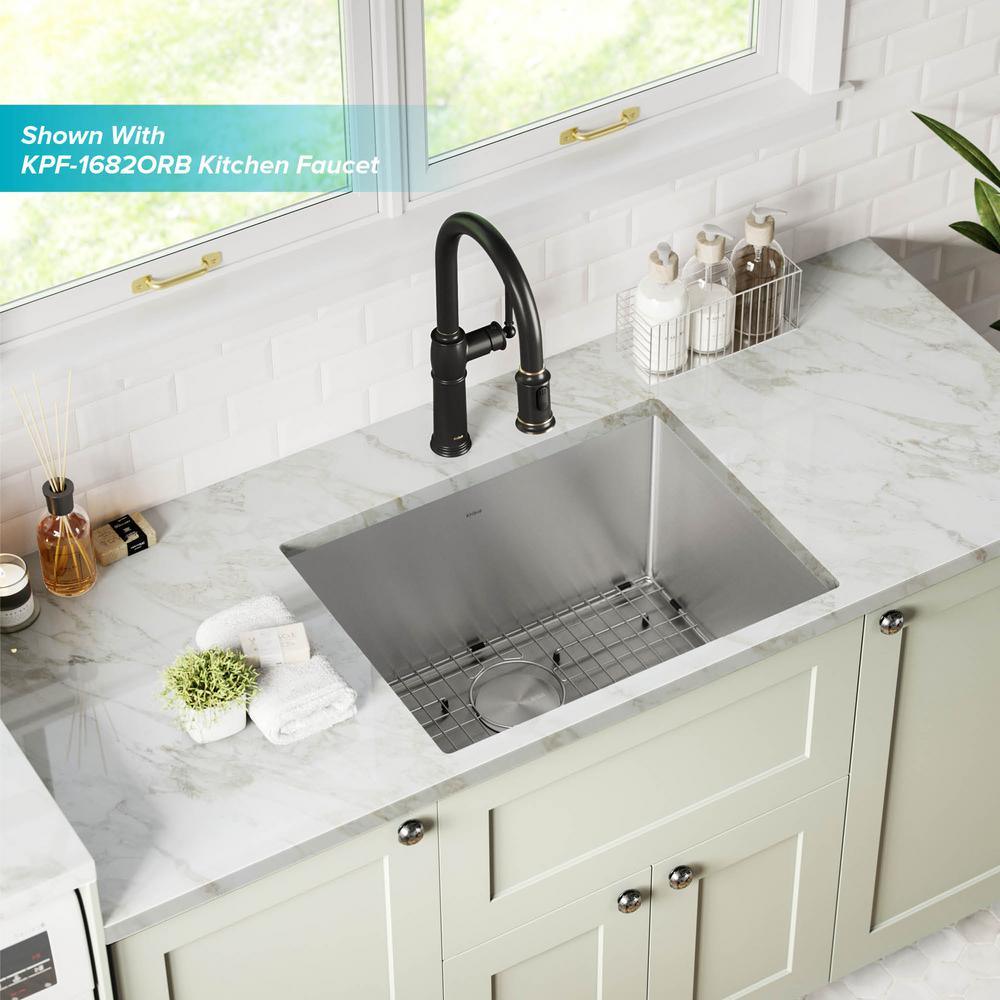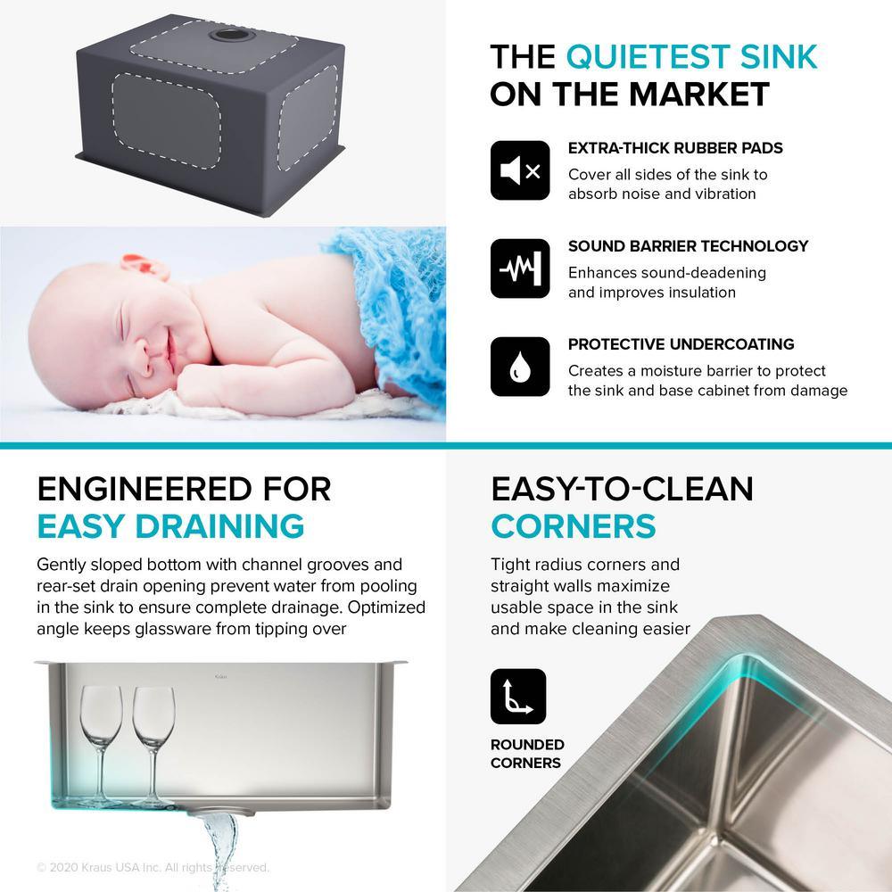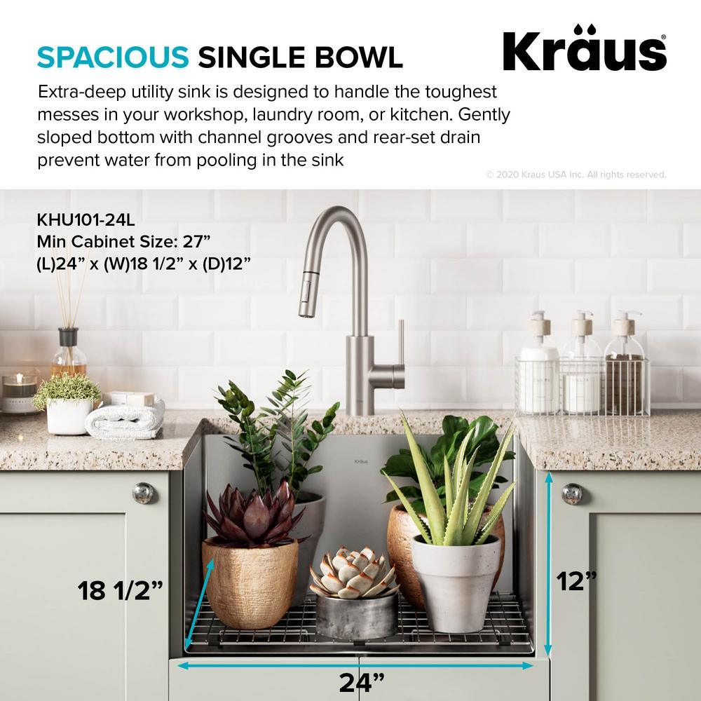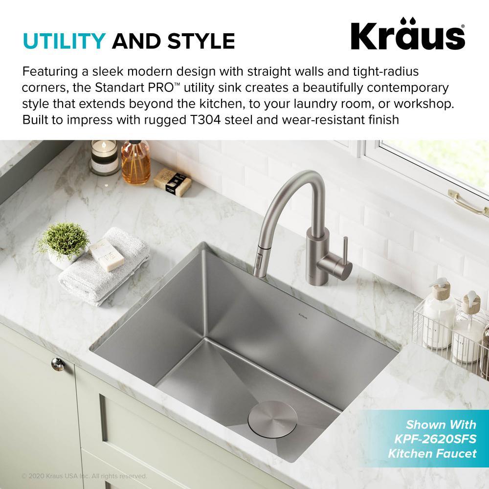 Featuring a sleek modern design with straight walls and easy-to-clean rounded corners, the heavy-duty extra-deep Standard PRO utility sink creates a beautifully contemporary look in your kitchen, bar, laundry room, or workshop. Constructed from proprietary KRAUS TRU16 - a heavy-duty, real 16-Gauge stainless steel - this workhorse of a sink offers superior durability with resistance to dents and damage. With an extra deep 12 in. bowl depth, this versatile sink will handle the toughest tasks, including washing oversized items and soaking large loads of laundry. Equipped with superior NoiseDefend sound dampening technology, with super-silencer pads to eliminate noise and vibration when the sink is in use. Non-toxic undercoating insulates the sink so that water holds its temperature and prevents condensation that can damage the base cabinet. Ideal for sinks that see a lot of use, the wear-resistant finish is extremely long-lasting, and will not rust or dull from daily use. Designed to drain quickly and completely, the rear-set drain opening and sloped bottom with channel grooves prevent water from pooling in the sink, ensuring that it drains better than the traditional flat-bottom laundry sink. Undermount installation creates a seamless transition between sink and countertop for a beautifully finished look and easy cleanup. Sink kit includes 3 premium accessories, including a protective stainless steel bottom grid and a premium drain assembly with decorative drain cap.