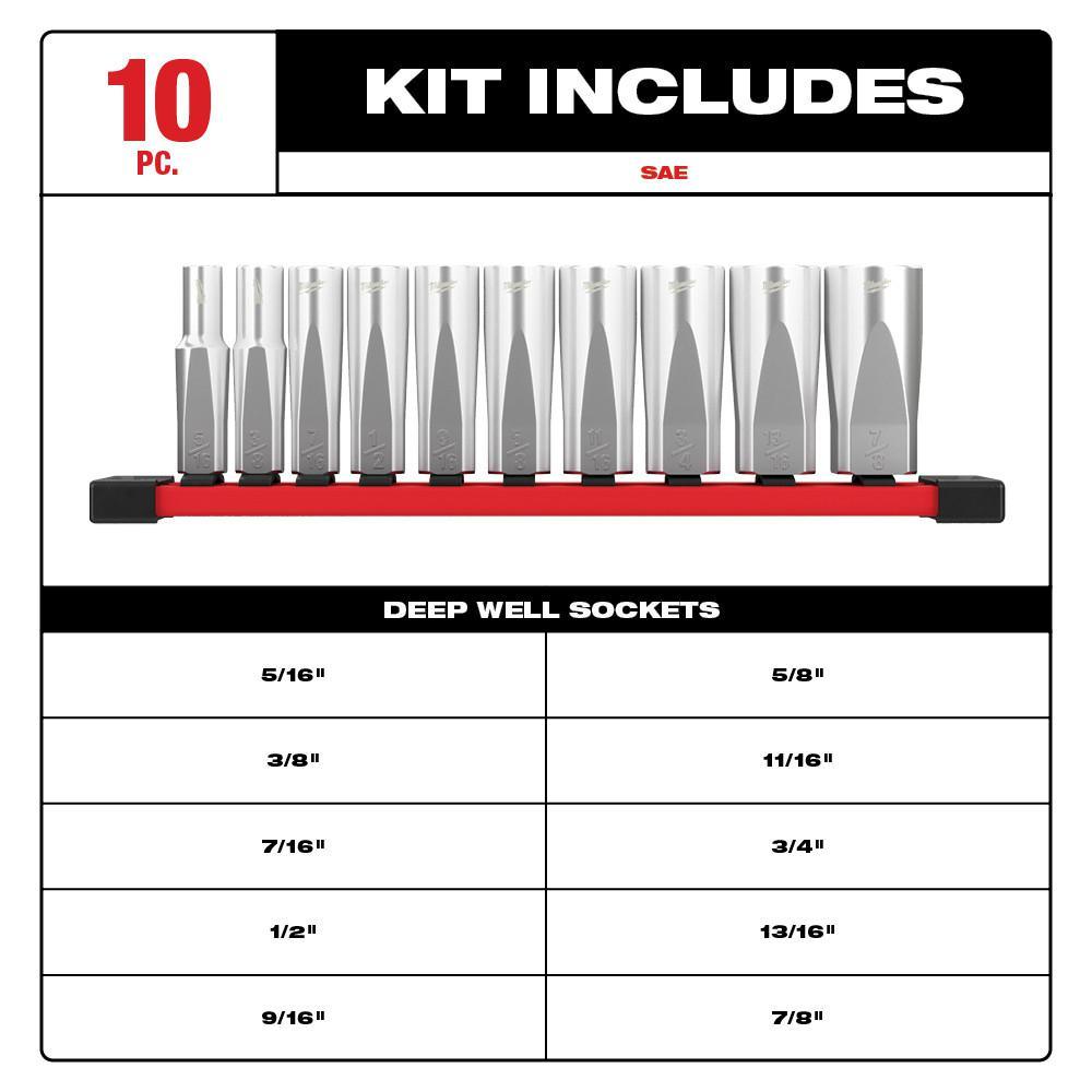 Milwaukee's 6-Point Sockets with FOUR FLAT sides feature an innovative design with 4 parallel flat sides, which deter rolling and are wrench-compatible. The socket sizes are stamped into the flats providing improved visibility. These deep well sockets have optimized geometry to reduce bolt rounding and stripping. These 10-piece sets are stored on a socket rail for tool organization and are backed with our Lifetime Guarantee.