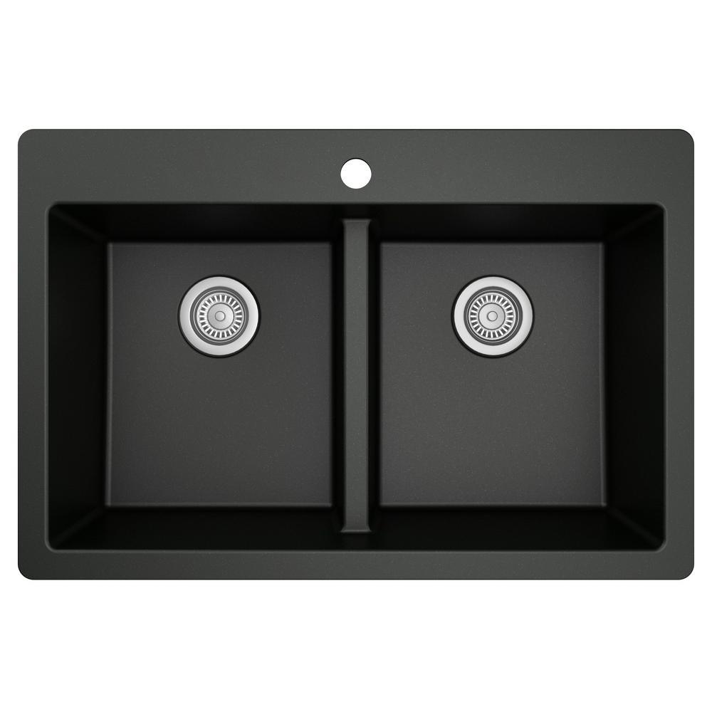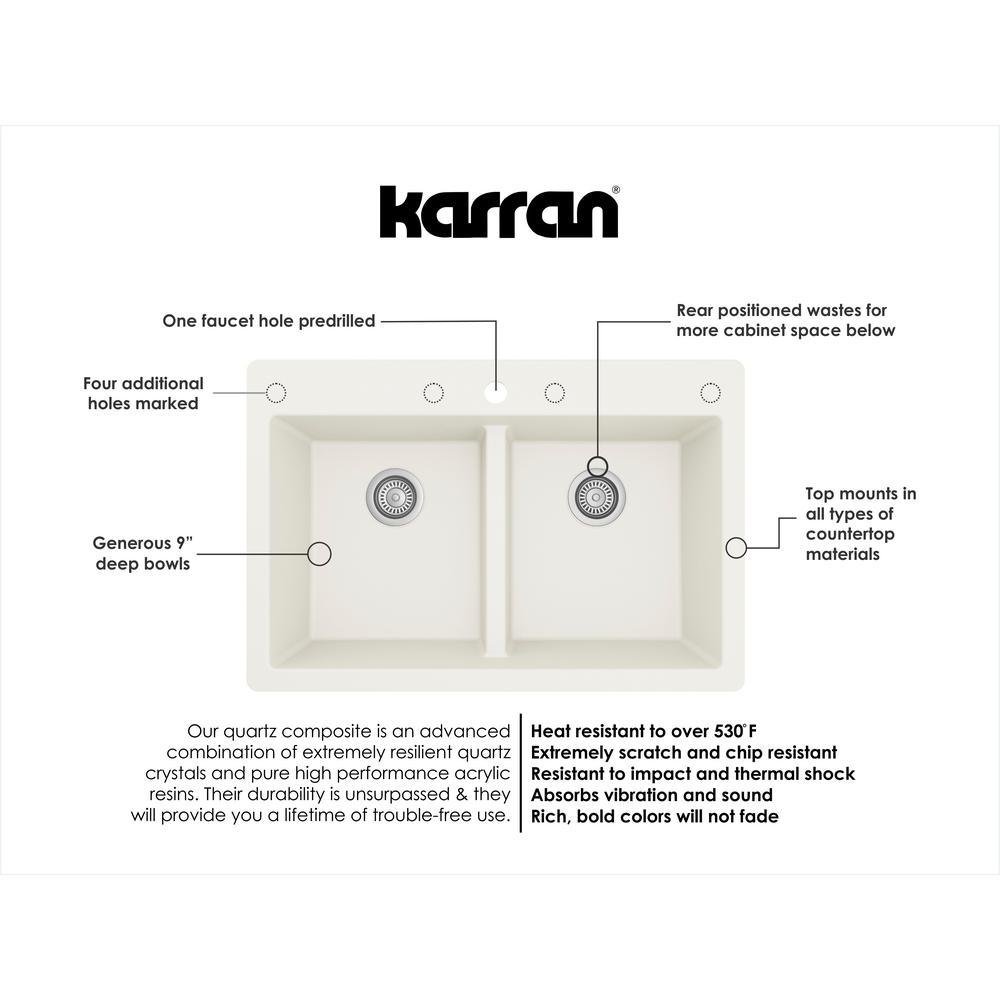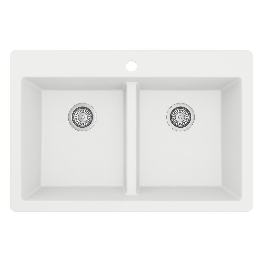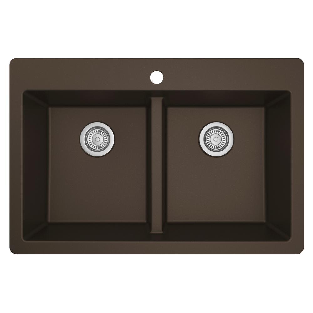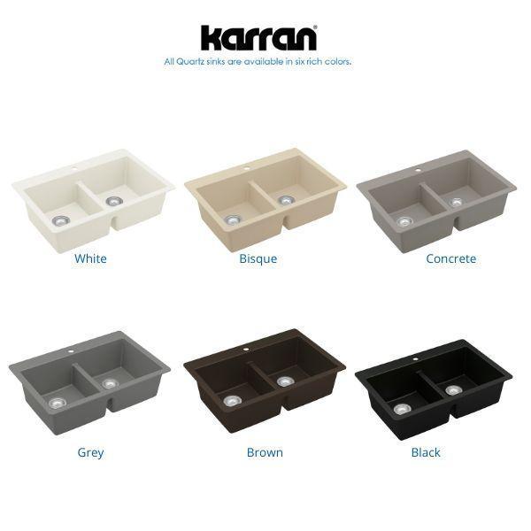 This modern design with crisp, linear styling is sure to be the focal point in your kitchen. Its quartz composite material gives it outstanding durability and will provide years of trouble-free use. This easy to install top mount design is available in a selection of 6 elegant color choices to compliment any decor. Features and Benefits. Designed for installation as a top mount sink in any countertop material. Made from 80% natural quartz crystals and pure acrylic resin. Heat safe up to 535°F and can withstand rapid temperature changes from hot and cold water. Durable quartz material is non-porous, prohibiting the spread of germs and bacteria. Smooth, non-porous material means food residue won't stick or stain the sinks surface. Extremely stain, scratch, abrasion and impact resistant. Quartz material absorbs vibration and minimizes noise when in use. Natural quartz combined with pure acrylic resins provides deep, rich colors with a choice of 6 to choose from, and UV stabilization to keep those colors looking like new for years. Regular cleaning is simple with just a cloth and soapy water. Rear drain locations leave more storage room in your cabinet below and 9 in. deep bowls provide plenty of room to accommodate all your cookware.