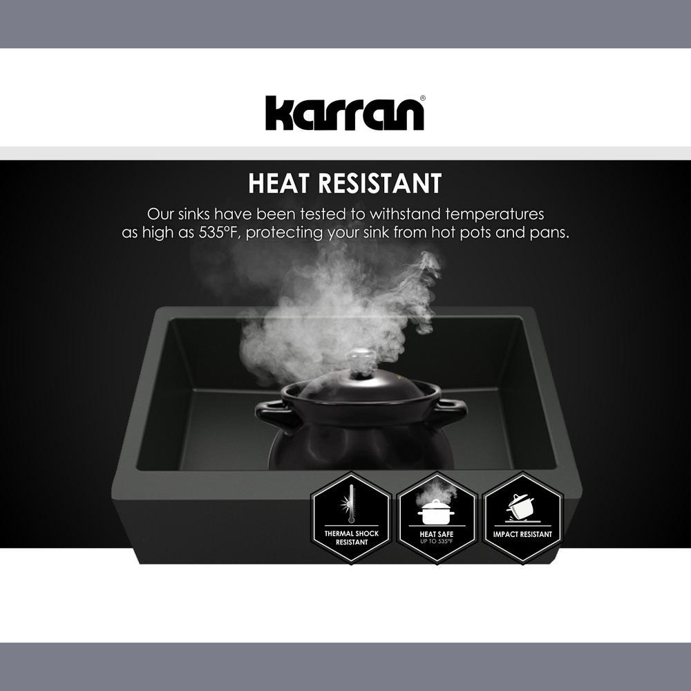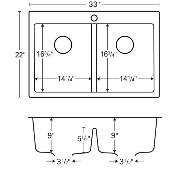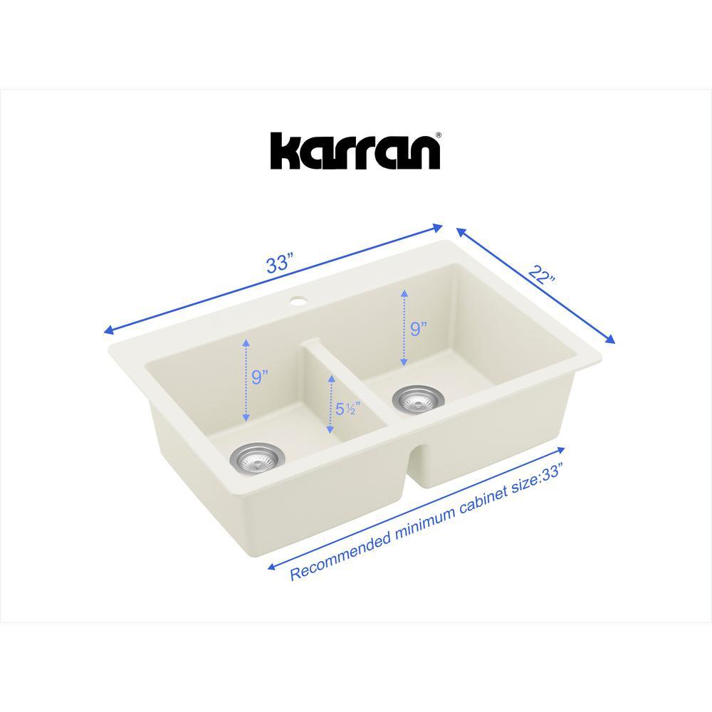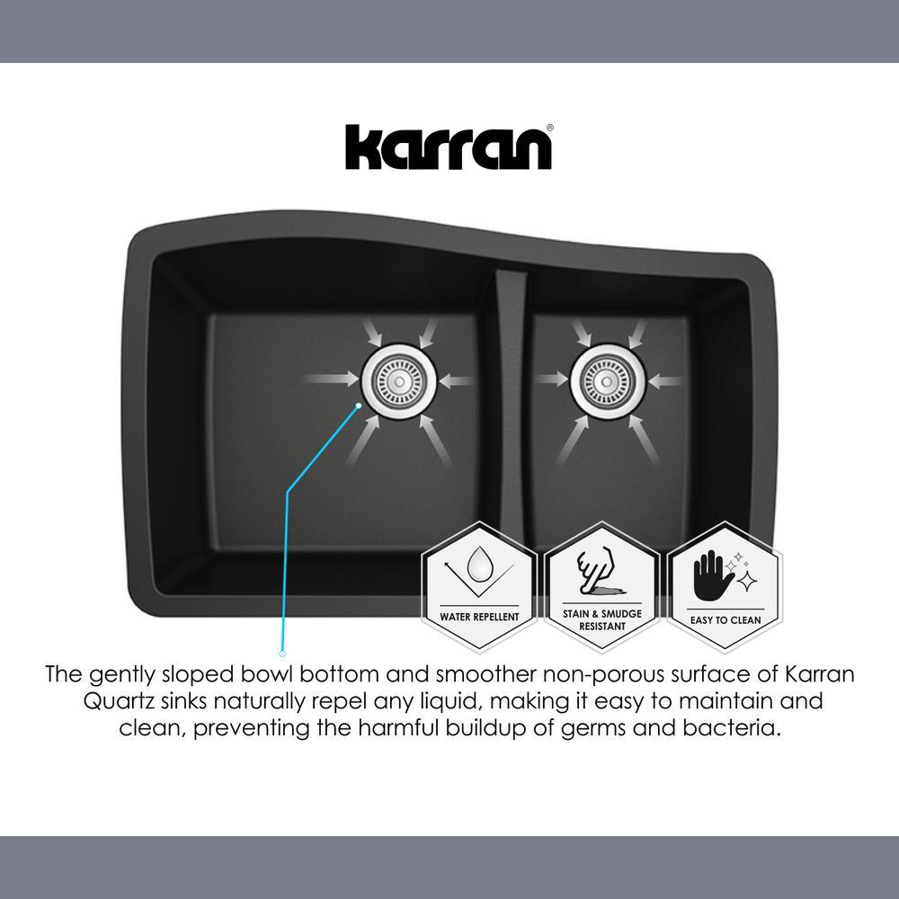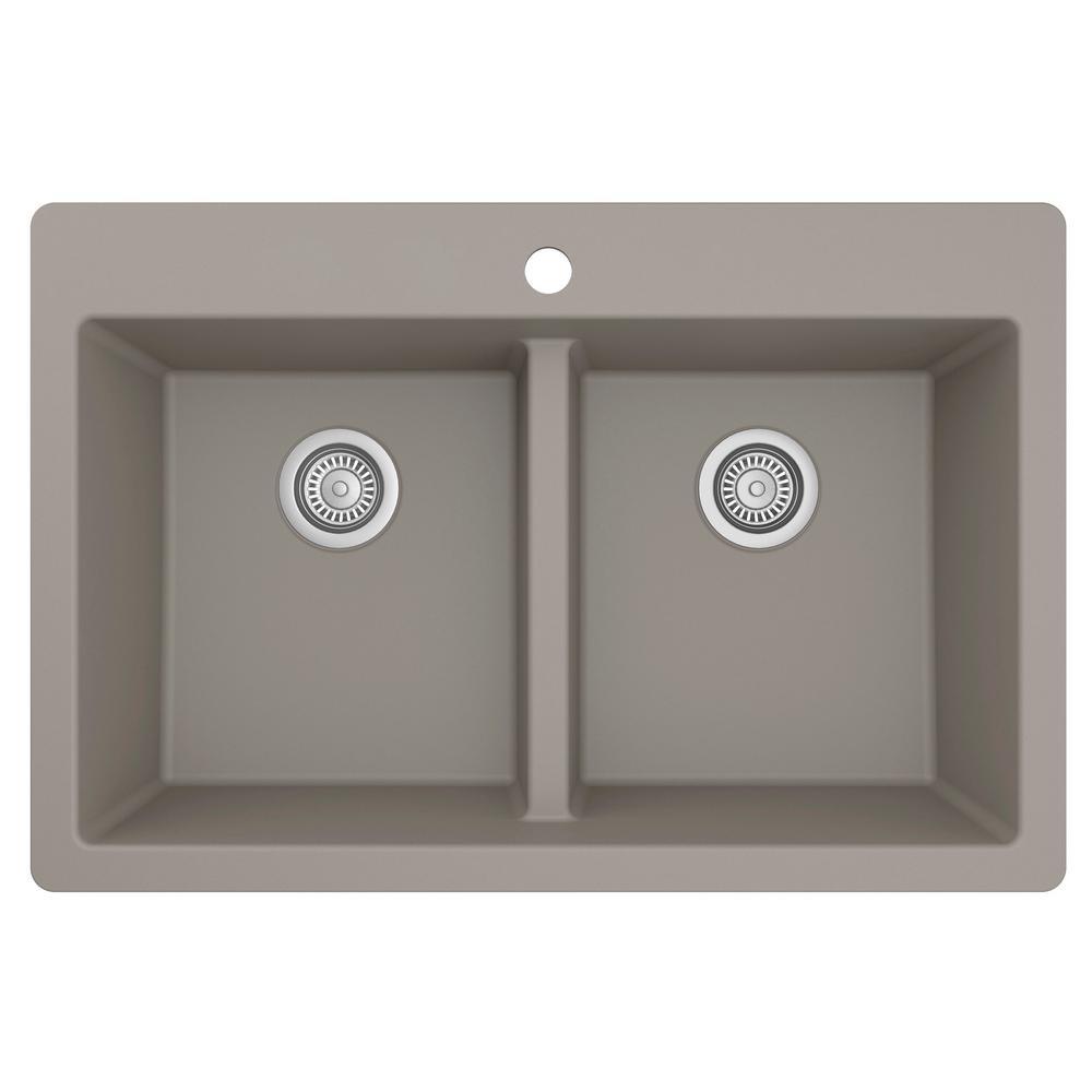 This modern design with crisp, linear styling is sure to be the focal point in your kitchen. Its quartz composite material gives it outstanding durability and will provide years of trouble-free use. This easy to install top mount design is available in a selection of 6 elegant color choices to compliment any decor. Features and Benefits. Designed for installation as a top mount sink in any countertop material. Made from 80% natural quartz crystals and pure acrylic resin. Heat safe up to 535°F and can withstand rapid temperature changes from hot and cold water. Durable quartz material is non-porous, prohibiting the spread of germs and bacteria. Smooth, non-porous material means food residue won't stick or stain the sinks surface. Extremely stain, scratch, abrasion and impact resistant. Quartz material absorbs vibration and minimizes noise when in use. Natural quartz combined with pure acrylic resins provides deep, rich colors with a choice of 6 to choose from, and UV stabilization to keep those colors looking like new for years. Regular cleaning is simple with just a cloth and soapy water. Rear drain locations leave more storage room in your cabinet below and 9 in. deep bowls provide plenty of room to accommodate all your cookware.