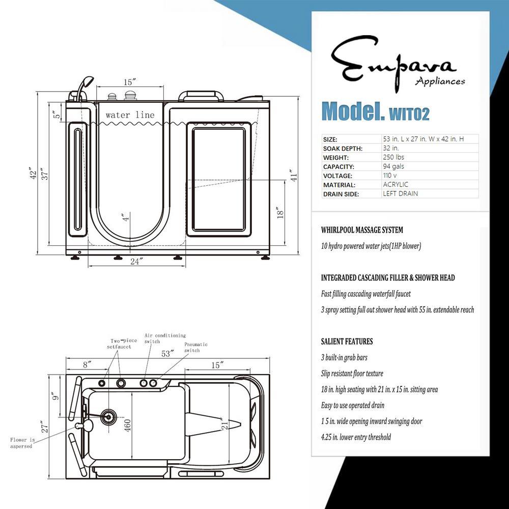 The 53 in. walk-In whirlpool tub by Empava Appliances INC is a perfect combination of style and practicality. The 10 water jets provide a deep, powerful, rejuvenating hydro massage good for the seniors or those with disabilities to soothe sore muscles and joints or to reduce stress. Easy access getting in and out with a low step-in threshold, extra-wide door, slip-resistant floor and easy-to-grip handrails keep you safe and secure as you ease in and out of your bath. During the past years, Empava walk-In whirlpool tub have been a very popular choice for bathroom upgrades and new builds.