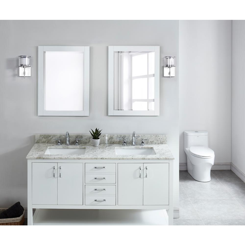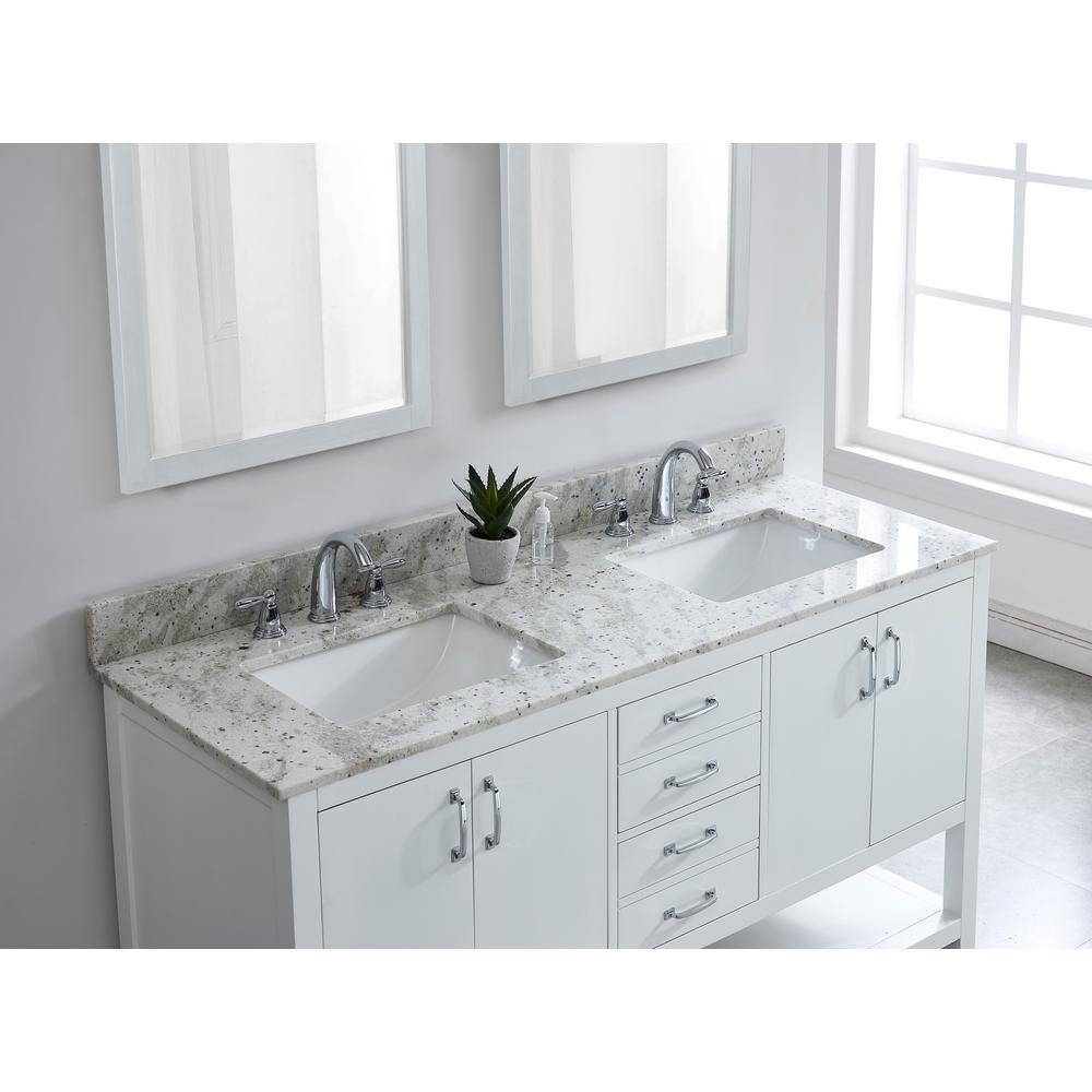 61 in. Glacier White Granite Top with Rectangular Undermount Sink in White. Attached stylish rectangular white vitreous china undermount bowl with safety overflow hole. 4 in. high backsplash included to help protect walls from water damage.