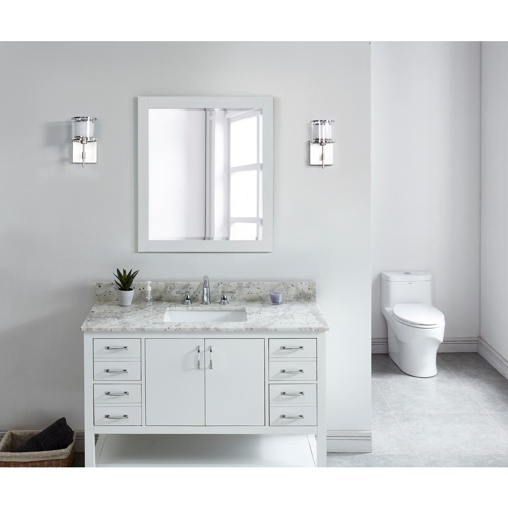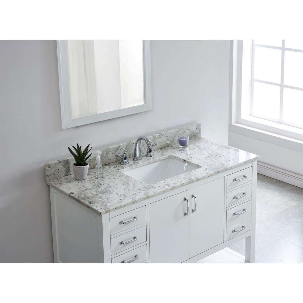 43 in. Glacier White Granite Top with Rectangular Undermount Sink in White. Attached stylish rectangular white vitreous china undermount bowl with safety overflow hole. 4 in. high backsplash included to help protect walls from water damage.