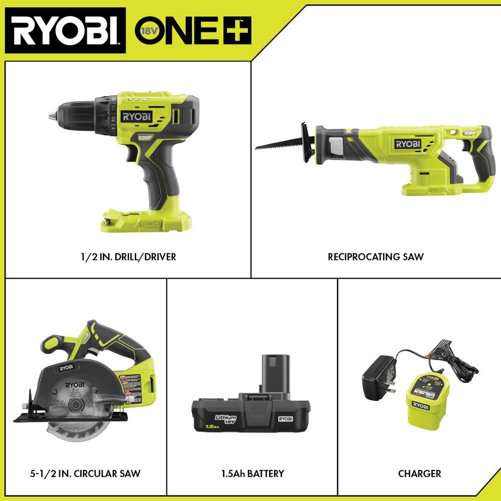 RYOBI introduces the 18V ONE+ Lithium-Ion Cordless Combo Kit (3-Tool) with (1) 1.5 Ah Battery, and Charger. The Drill/Driver has a 1/2 in. heavy duty single sleeve keyless chuck with 24-position clutch to match your drilling and driving needs. The Circular Saw has front pommel handle for 2-handed operation and a left side blade for better cutline visibility. The Reciprocating Saw includes a variable speed trigger to provide more control while cutting a variety of materials. Best of all, this combo kit is a part of the RYOBI ONE+ System of over 175 tools that all work on the same battery platform. Backed by the RYOBI 3-Year Manufacturer's Warranty, the 18V ONE+ 3-Tool Combo Kit includes a drill/driver, a circular saw, a reciprocating saw, a 1.5 Ah battery, an 18V charger, and operator’s manuals.