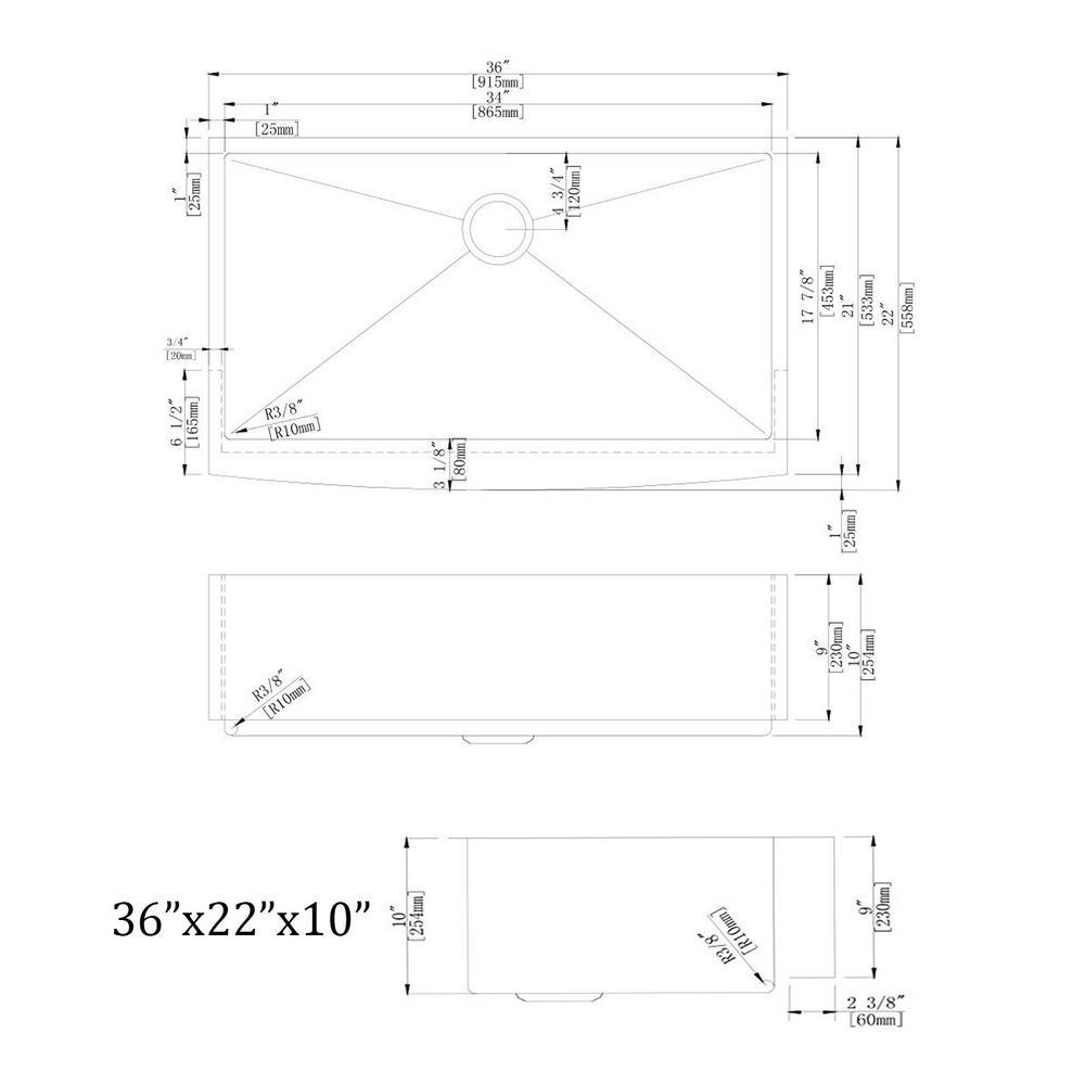 • Exterior dimensions: 36 in. W x 22 in. L x 10 in. D; Interior bowl dimension: 34 in. W x 17.87 in. L x 9 in. D; Minimum Base Cabinet: 39 in. W.