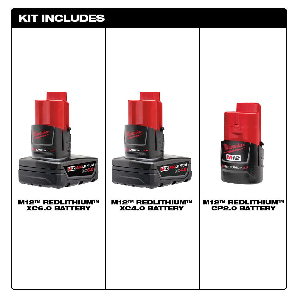 • Includes: one 48-11-2464- 1 M12 XC 6.0 battery, 1 M12 XC 4.0 battery, 1 M12 CP 2.0 battery