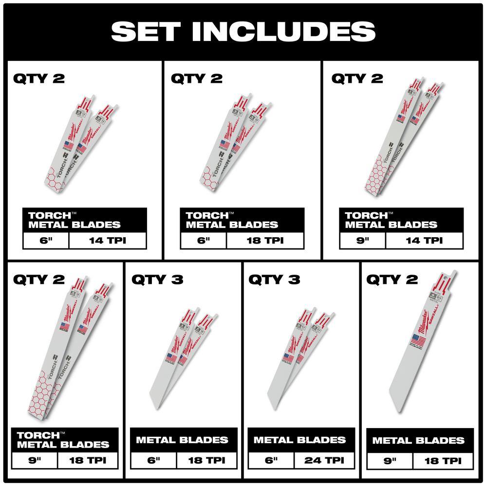 The Milwaukee 61-piece SAWZALL reciprocating saw blade & SHOCKWAVE Driving Bit set features an assortment of metal cutting SAWZALL blades for a broad range of professional applications. The TORCH demolition metal cutting blades provide 5X blade life and facilitate tough cuts. They also feature GRID IRON technology for increased blade stiffness. The metal cutting blades feature TOUGH NECK ribs that strengthen the blade tang and minimize breakage. Impact Driver Bit Set is engineered to be the Most Durable, Best Fitting driver bits on the market. The Wear Guard Tip delivers increased wear resistance which protects the impact bit's fit over the life of the bit. The Shockzone is optimized for each tip type and length of driver bit in the set to absorb peak torque and prevent breaking. The driver bits have Custom Alloy76 for a customized steel and heat treatment per tip type to extend the life of the user's driver bits, providing up to 50X life versus other impact driver bits on the market. The Milwaukee Shockwave driver bits are built to provide users with extreme durability for the most demanding applications.