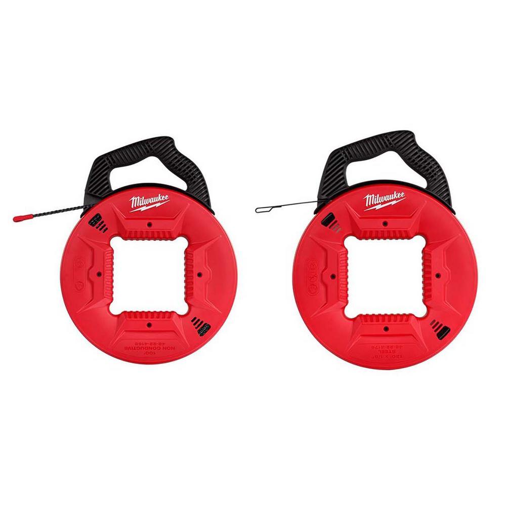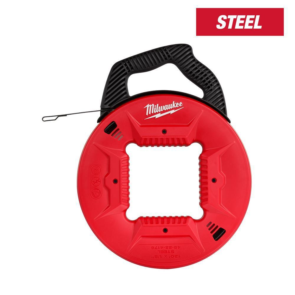 The Milwaukee 100 ft. Polyester Fish Tape with Non-Conductive Tips features a high flexibility tape for the easiest fishing. The triple strand design won't kink after repeated use and delivers a more durable tape. The non-conductive tip allows users to safely handle wire and cable in electrical applications. A low friction case provides users with a smooth payout and easy rewind. The fish tape features a multi-position handle allowing users to comfortably use the fish tape in any jobsite scenario. Milwaukee 120 ft. 1/8 in. Steel Fish Tape features a low friction case providing users with smooth pauserst and easy rewind. High-visibility laser etched markings on the tape allow users to accurately measure depth and position. The blue tempered steel balances strength and flexibility for easier fishing. The fish tape features a multi-position handle allowing users to comfortably use the fish tape in any jobsite scenario.