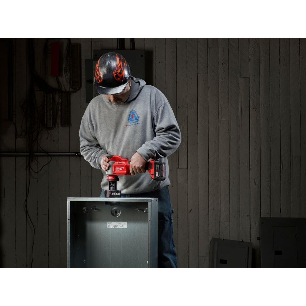 The MILWAKUEE M18 FORCE LOGIC 10 Ton Knockout Tool 1/2 in.-4 in. Kit reduces the tedious steps of hole making, improving user speed and limiting user fatigue. This knockout punch tool is powerful enough to punch up to 6 in. holes in 12-Gauge mild steel and 14-Gauge stainless steel. The Quick Connect Alignment System provides users with easy set-up without the weight of the tool and speeds up repetitive punching. The tool is compatible with all Milwaukee EXACT punches and dies. The knockout dies are rated for both mild and stainless steel punching. Vivid red cross hairs provide users with accurate alignment and slug removal ports provide optimal slug removal. The gripping surface on the EXACT punches enables users to thread faster. The cordless 10-ton knockout tool delivers the Easiest Way to Punch. M18 FUEL Compact Band Saw offers a light-weight, balanced design with a 3-1/4 in. x 3-1/4 in. cutting capacity, the largest of any compact band saw. The M18 FUEL Compact Band Saw is the fastest cutting band saw in its class with a POWERSTATE Brushless motor and Constant Power Technology. Equipped with Jobsite Armor Technology, this cordless band saw is better protected from drops and debris with a proprietary composite material and crush zone barriers to absorb impacts.