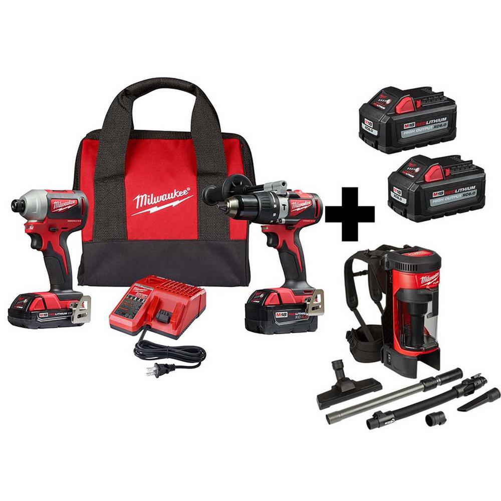 - Includes: (1) 2902-20 hammer drill driver, (1) 2850-20 impact driver, (1) M18 compact REDLITHIUM 2.0 Ah battery (48-11-1820), (1) M18 REDLITHIUM 4.0Ah XC extended capacity battery (48-11-1840), (1) M18 and M12 multi-voltage charger (48-59-1812), (1) belt clip, (1) contractor bag, (2) M18 REDLITHIUM HIGH OUTPUT XC 6.0 Ah battery packs, (1) 0885-20 M18 FUEL 3-in-1 backpack vacuum, HEPA filter, flexible hose, telescoping extension wand, floor tool, crevice tool, dust extraction adapter