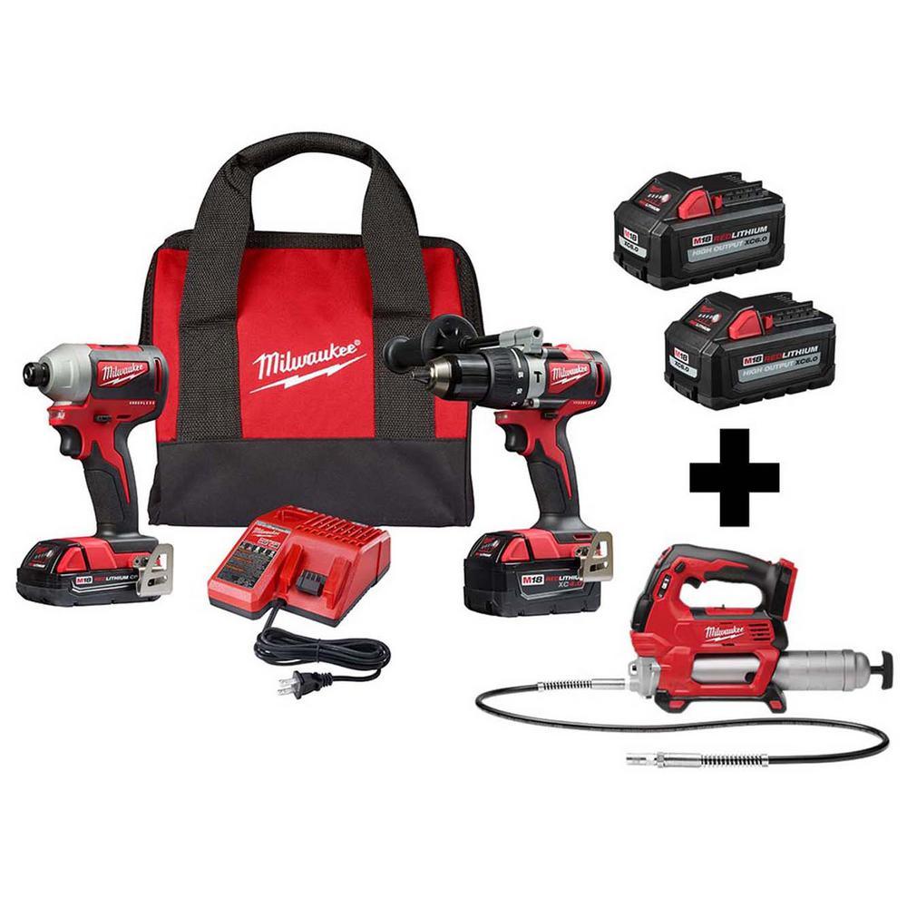 - Includes: 2902-20 hammer drill driver, 2850-20 impact driver, (1) M18 compact REDLITHIUM 2.0 Ah battery (48-11-1820), (1) M18 REDLITHIUM 4.0 Ah XC extended capacity battery (48-11-1840), (1) M18 and M12 multi-voltage charger (48-59-1812), (1) belt clip, (1) contractor bag, (1) 2646-20 M18 2-speed grease gun (1) 48 in. flex hose with spring guard, (1) high pressure grease coupler, (2) M18 REDLITHIUM HIGH OUTPUT XC 6.0 Ah battery packs