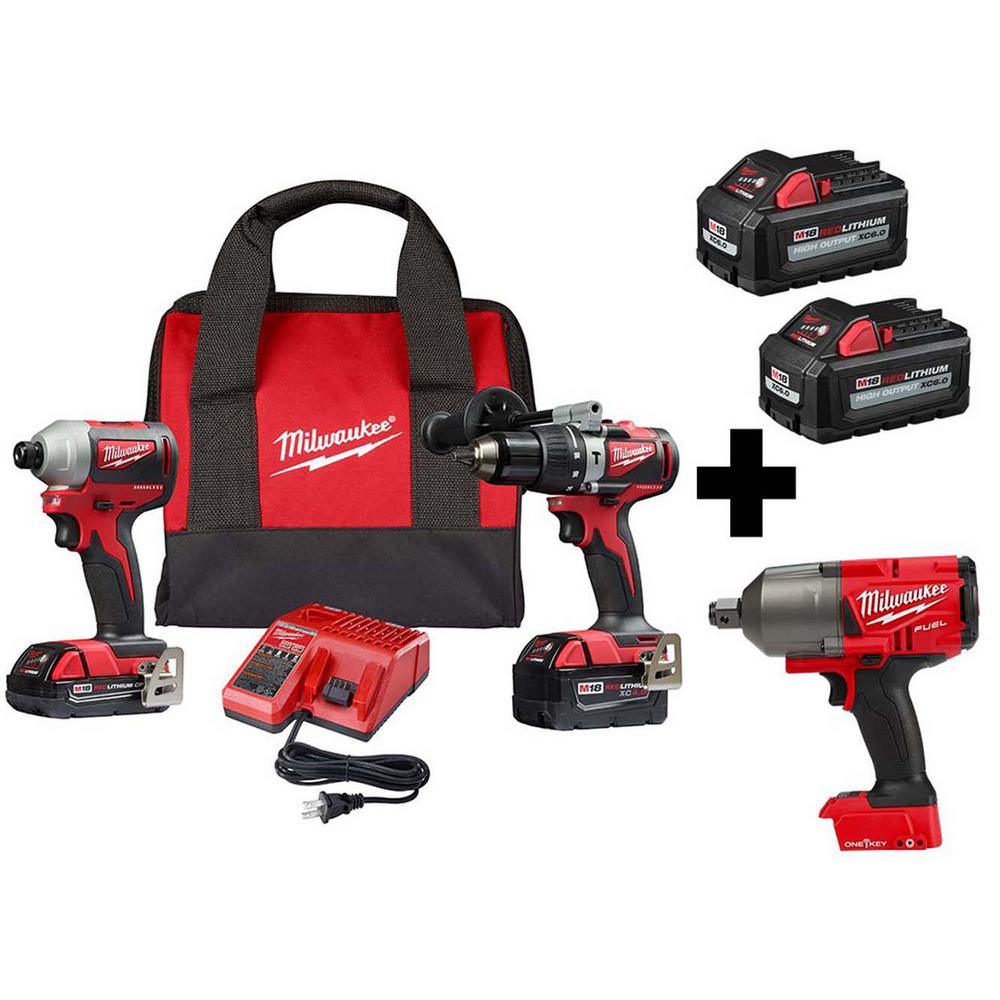- Includes: 2902-20 hammer drill driver, 2850-20 impact driver, (1) M18 compact REDLITHIUM 2.0 Ah battery (48-11-1820), (1) M18 REDLITHIUM 4.0 Ah XC extended capacity battery (48-11-1840), (1) M18 and M12 multi-voltage charger (48-59-1812), (1) belt clip, (1) contractor bag, (1) 2646-20 M18 2-speed grease gun (1) 48 in. flex hose with spring guard, (1) high pressure grease coupler, (2) M18 REDLITHIUM HIGH OUTPUT XC 6.0 Ah battery packs