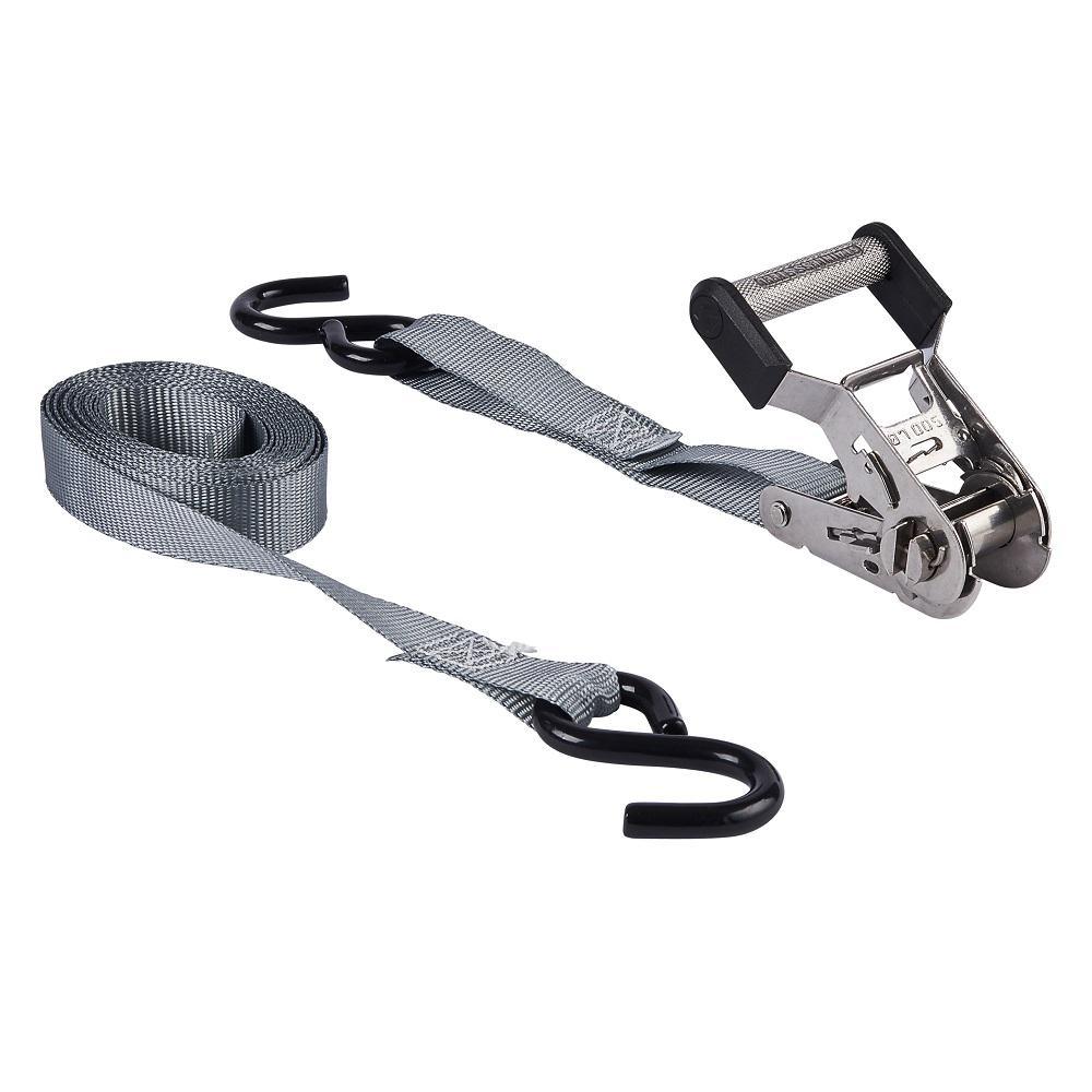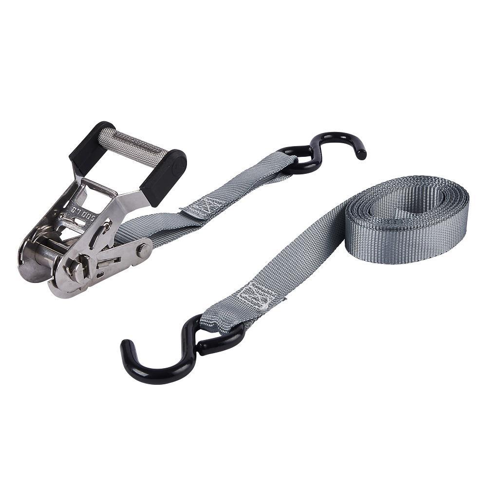 The Keeper 12 ft. Stainless Steel Ratchet Tie-Down features an abrasion-resistant 1 in. Hi-Test webbing to absorb shock during transportation, corrosion-resistant ratchet buckle, open molded handle, and heavy-duty vinyl covered s-hooks to prevent scratching and marring. The ratchet buckle is designed with a rotating gear and lever mechanism latch to tighten and secure light to medium loads. To engage, attach the hook to an anchor point, secure webbing over cargo load, pull webbing to desired tension leaving a bit of slack and ratchet by raising and lowering the handle. The webbing then locks into place to secure the cargo.