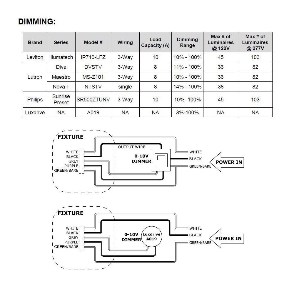 • 10% to 100% dimming range with Lutron or Leviton 0-Volt to 10-Volt dimmers