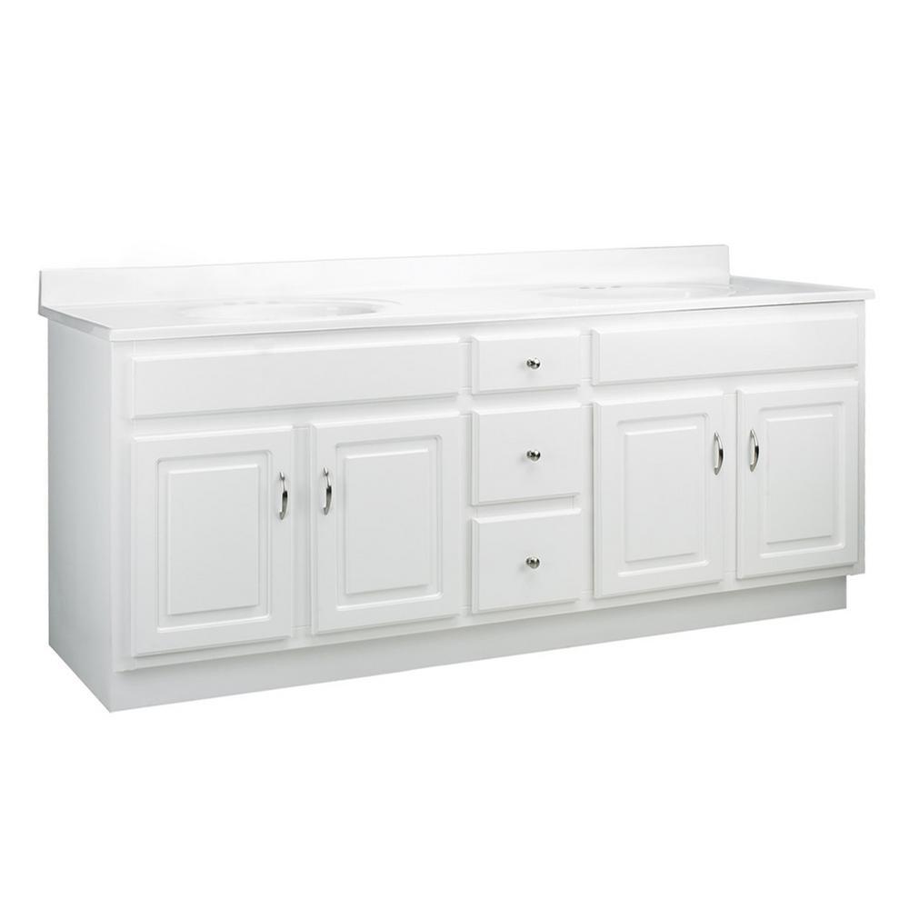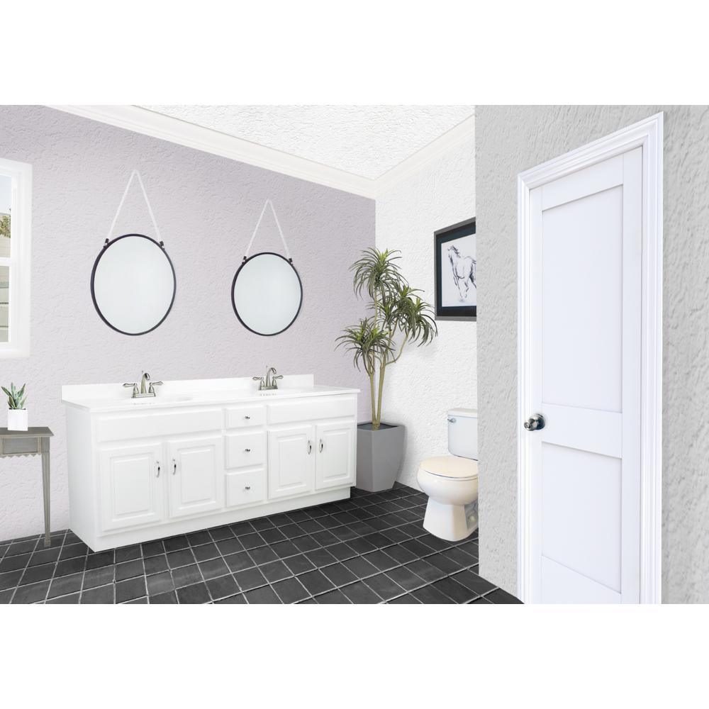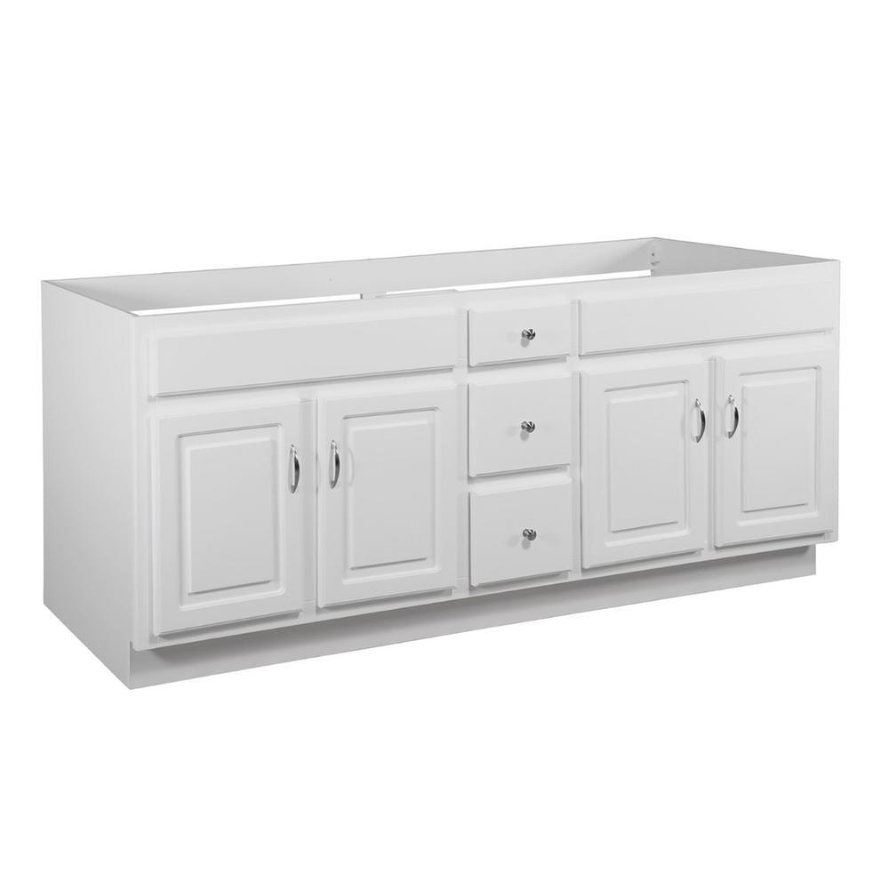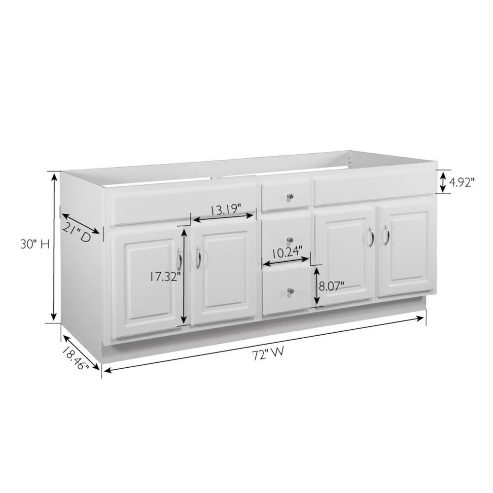 Give your bathroom a boost of elegance with the Design House 72 in. Concord Vanity Cabinet. Modern design meets traditional charm, this piece offers clean lines and a durable white finish. Features include 2 fully functional drawers (1 faux drawer) with easy glide drawer hardware and 4-doors that conceal generous interior space, perfect for storing toiletries, cleaning supplies, and more. The vanity base measures 72 in. x 21 in. and comes unassembled with satin nickel hardware included.