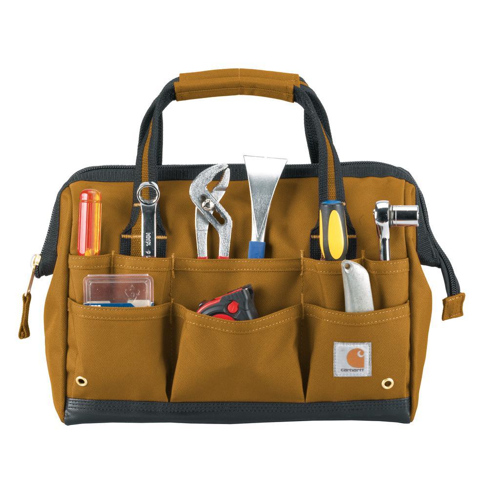 Get the job done right the first time with the Carhartt Legacy Tool Bag. Perfect for the DIY-er and those who show up to the job site every day. Constructed of heavy-duty 1200D Poly with Rain Defender durable water repellent, this rugged bag can handle even the toughest jobs. It also features a Duravax abrasion-resistant base or custom molded load-bearing base, both of which provide extra protection from hazardous job site conditions as well as scrapes and punctures from tools. Note the triple needle stitch provides reinforcement where it counts. The internal metal frame offers structure to the bag so you can get in and get out without it collapsing in on itself. Tools stay organized and easy to find with a variety of different sized pockets and loops. Additional details: YKK zippers, metal hardware, reinforced webbing and comfort grip haul handles, Carhartt logo patch.