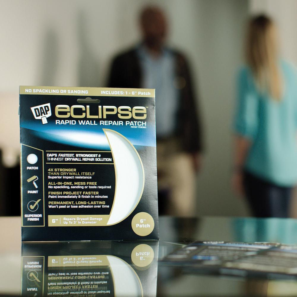 DAP Eclipse Rapid Wall Repair Patch is a new, revolutionary product solution for repairing drywall damage. No more waiting for spackling to dry or messy sanding. DAP Eclipse allows you to patch drywall damage and paint immediately, allowing you to finish your project faster. This all-in-1, mess free solution not only provides a permanent, long-lasting repair but also superior impact resistance for areas that may see reoccurring impact, such as behind a door.