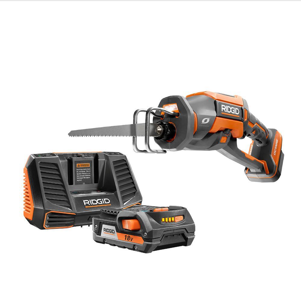 RIDGID introduces the 18-Volt OCTANE Cordless Brushless One-Handed Reciprocating Saw with 18-Volt Lithium-Ion 2.0 Ah Battery and Charger Kit. OCTANE Tools feature high performance brushless motors and advanced electronics, providing best-in-class power and intelligence. This tool, when paired with an OCTANE battery, delivers 3X the power and 30% less vibration in high demand applications compared to our previous corded unit. This tool features best-in-class in demolition cuts with the option to use orbital action for wood cuts and non-orbital action for metal cuts. With registration, this tool is backed by the Industry's Only Lifetime Service Agreement. The One-Handed Reciprocating Saw includes a reciprocating saw blade, a 2.0 Ah Lithium-Ion Battery, an 18-Volt Charger, and an operator's manual.