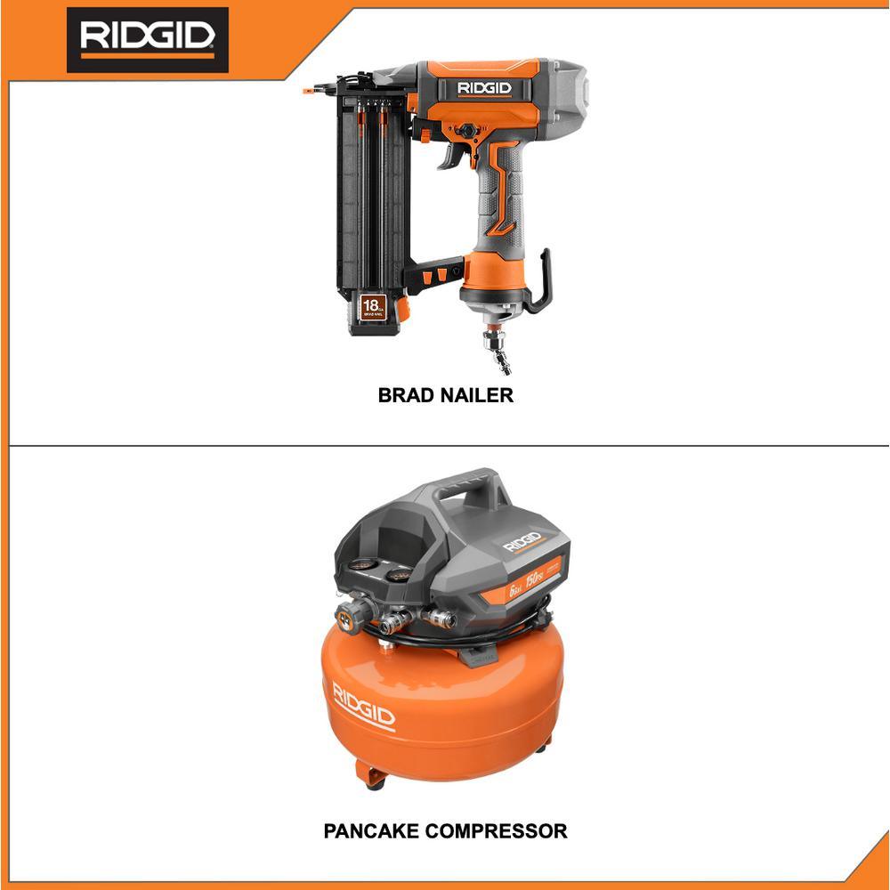 RIDGID introduces the 6 Gal. Electric Pancake Air Compressor and 18-Gauge 2-1/8 in. Brad Nailer. The RIDGID 6 Gal. Horizontal Pancake Compressor and 18-Gauge 2-1/8 in. Brad Nailer Combo is packed with features and perfect to start with for any trim crew, DIY or professional. This compressor is powerful and great for trim and finish work with 150 PSI and the nailer features FASTEN EDGE Technology, an industry-leading feature set. The compressor works with multiple people on the job site with dual universal quick connectors and can be used with 2 nailers at once. Equipped with a best-in-class oil-free pump for reliable and maintenance-free performance, this compressor has everything you need to get the job done. The compressor is backed by the RDIGD 3-Year Manufacturer's Warranty, the nailer is backed by RIDGID's Lifetime Service Agreement. This combination kit includes the 6 Gal. Horizontal Pancake Compressor, the 18-Gauge 2-1/8 in. Brad Nailer, a 25 ft. hose, and operator's manuals.