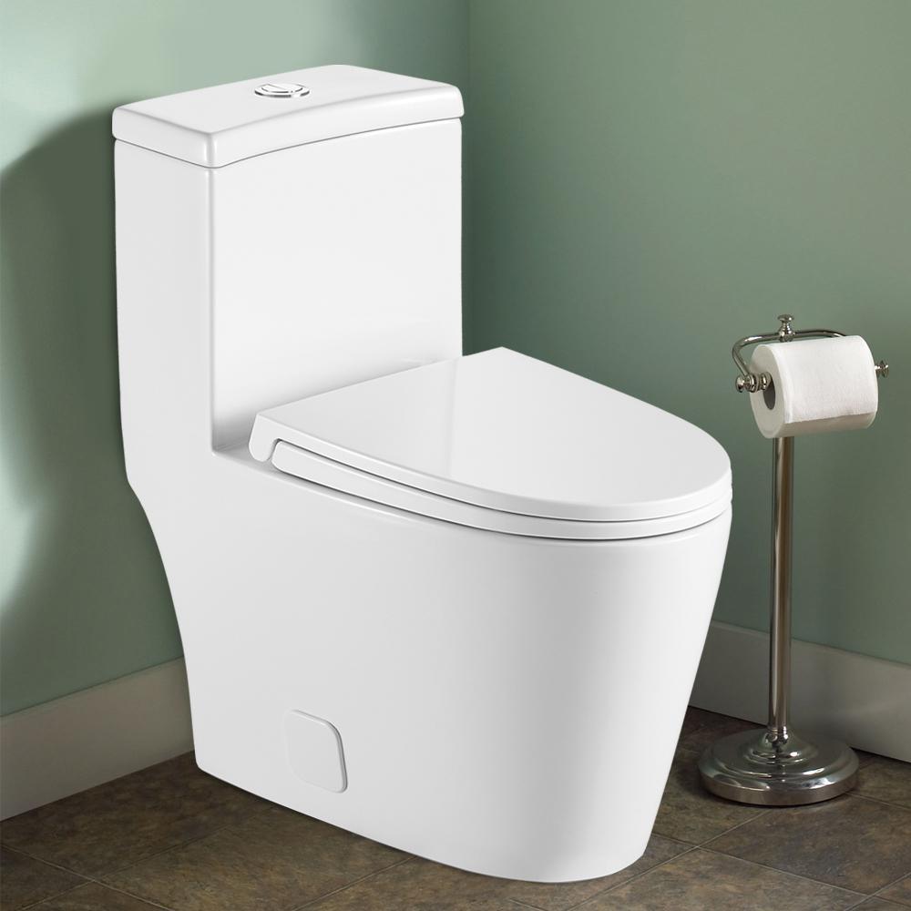 - Dual flush elongated one piece toilet with soft closing seat and round button